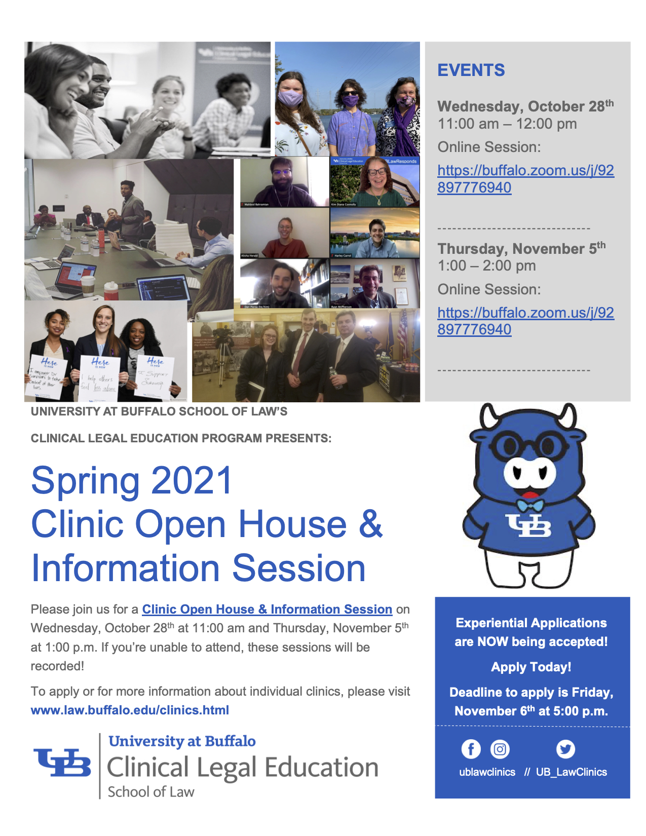 The Clinical Program will be holding another Open House/ Information Session on Thursday, November 5th from 1:00 - 2:00 p.m. on zoom, available at: https://buffalo.zoom.us/j/92897776940