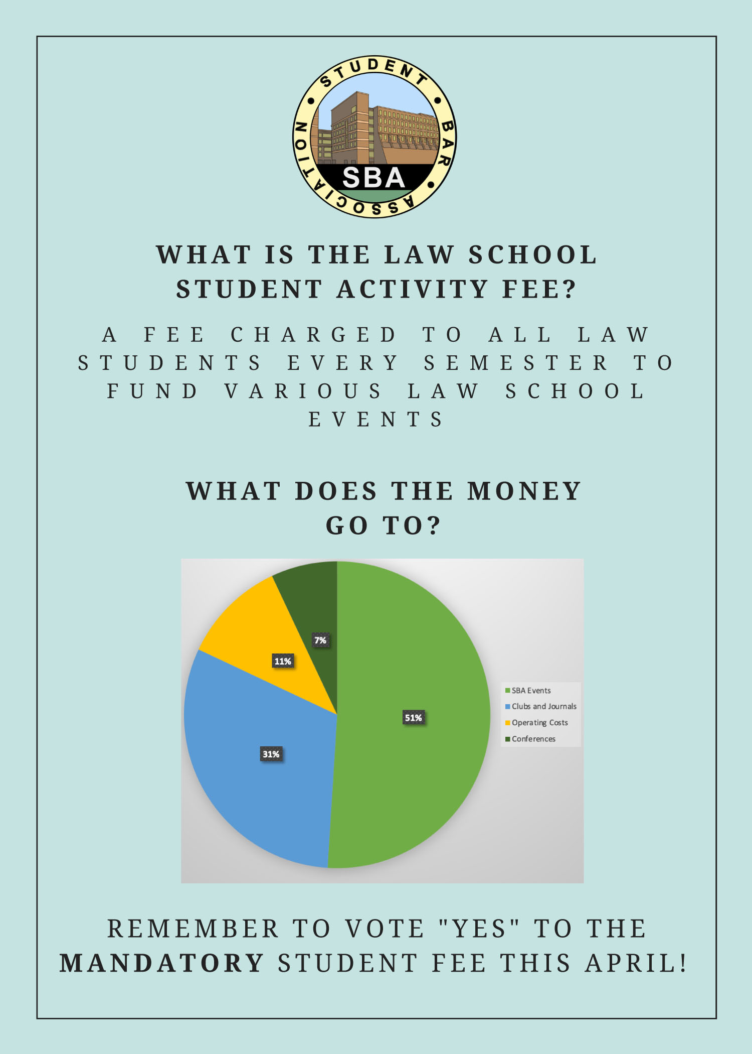 These services include funding for other clubs under the SBA umbrella, publication of law journals, social events like the Halloween party and Barrister's Ball, graduation cords, the list goes on and on and on....