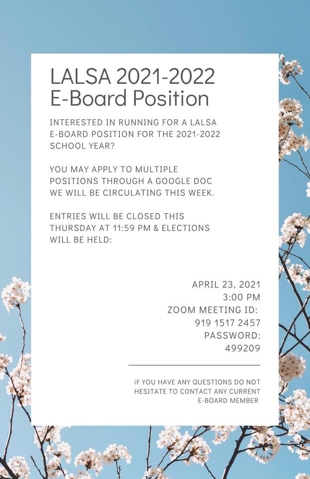This week LALSA is having its e-board elections for 2021-2022 academic year.
