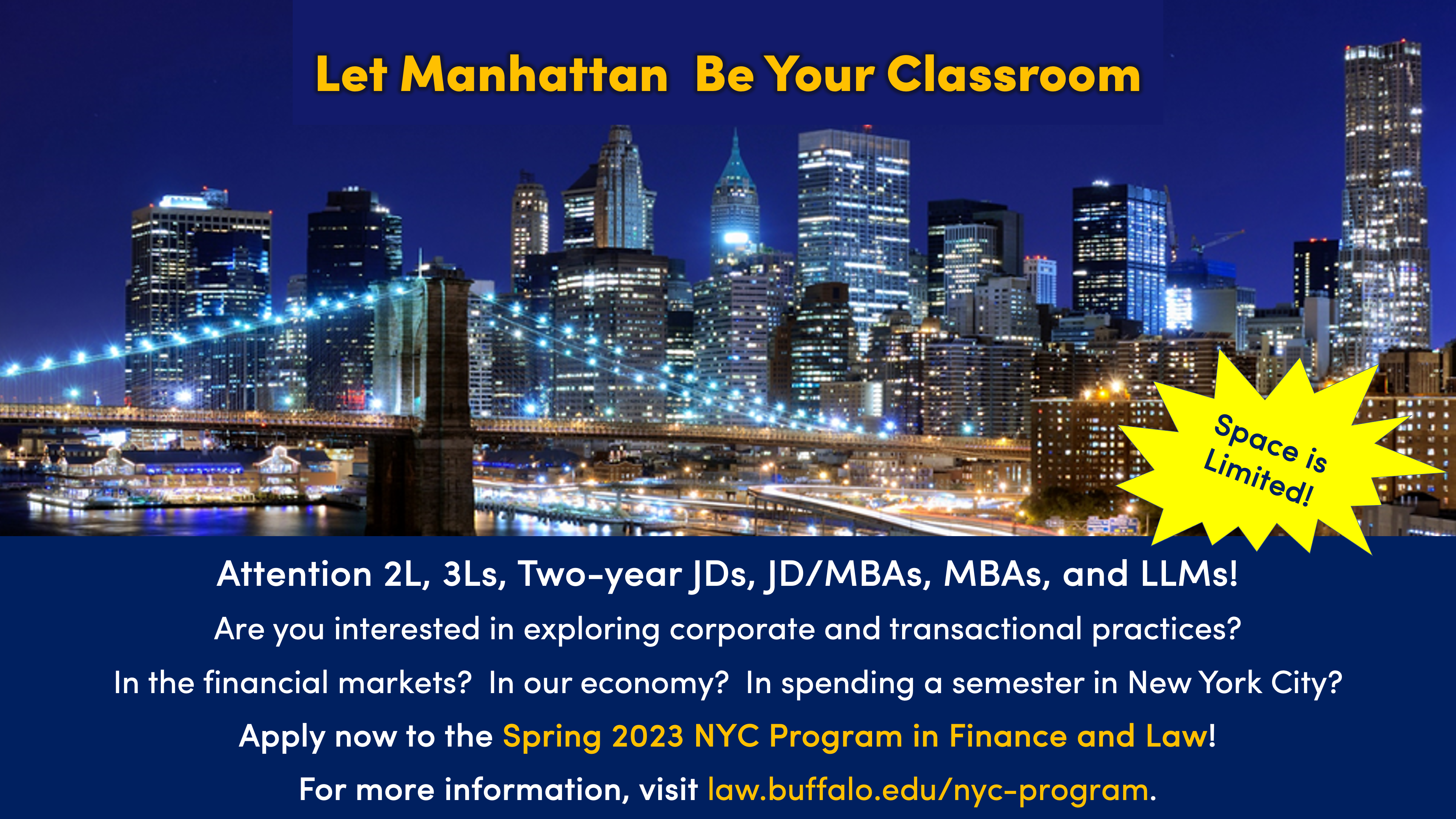 The Program enables students to spend a semester at the heart of global financial markets, learning about a variety of legal and business practices. Taught largely by practitioners with real-world experience, the Program features externships and an array of opportunities to get a feel for working and living in the Big Apple. The Program is open to 2L & 3Ls, two-year JDs, JD/MBAs, MBAs, and LLMs. Applications are still being accepted and consist of a resume, unofficial transcript and a statement of interest.