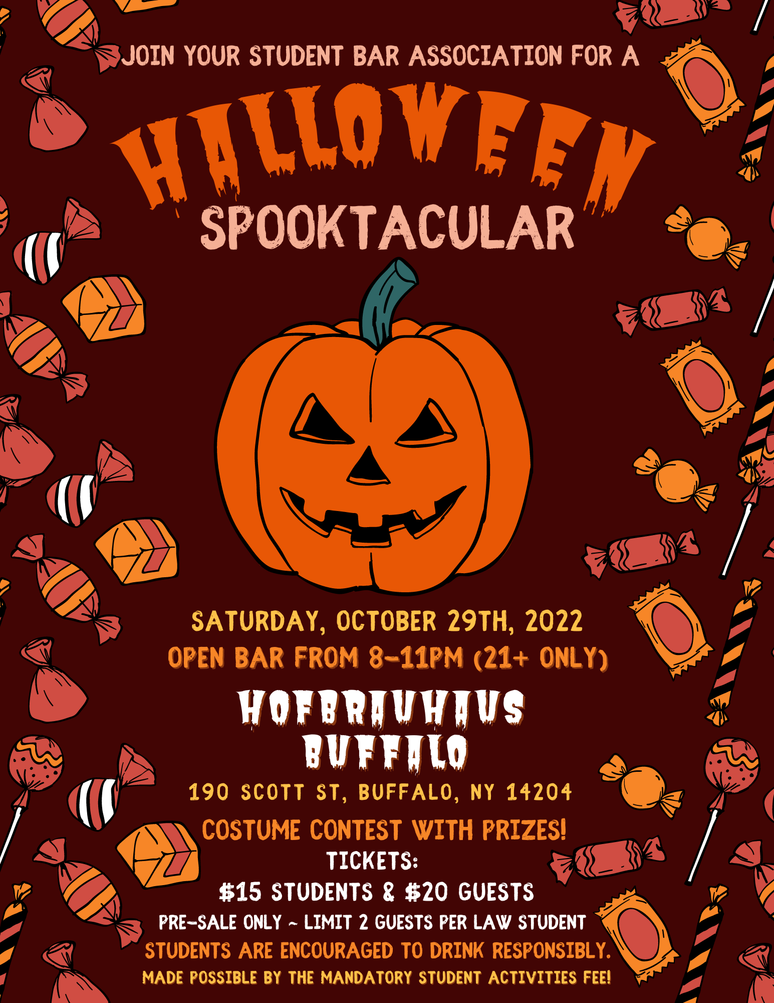 Join your Student Bar Association on Saturday, October 29th at Hofbrauhaus Buffalo for a Halloween Spooktacular! The event will feature light appetizers and an open bar from 8:00 PM - 11:00 PM. Dress to impress for a costume contest with prizes! The event will be happening in conjunction with Hofbrauhaus' own Halloween party, the "Haunted Haus Halloween Party featuring XOXO POP BAND!" Tickets will be available via the UB Ticket Office and will be presale only. $15 for law students and $20 for guests. Limit 2 additional guest tickets per law student. Event made possible by the Mandatory Student Activities Fee. This event is 21+, SBA encourages all attendees to drink responsibly. Hofbrauhaus is located at 190 Scott St, Buffalo, New York 14204.