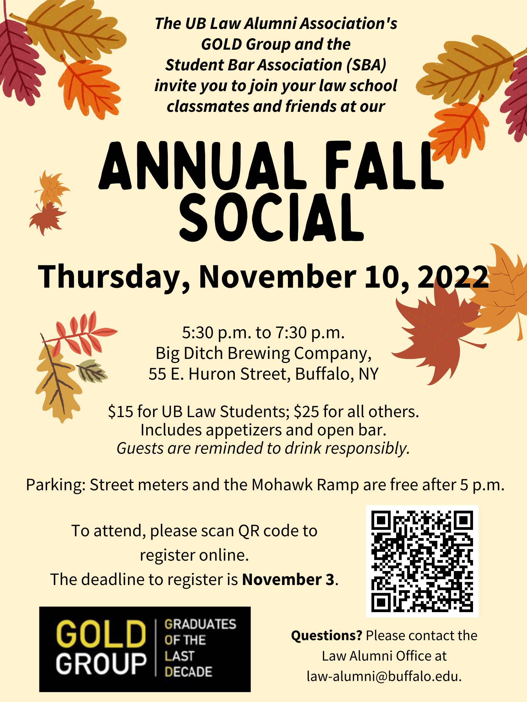 UB Law Alumni Association's GOLD Group and your SBA are hosting a social at Big Ditch on Thursday, November 10th from 5:30-7:30. Tickets are $15 for students and $25 for all others. Cost includes an open bar (beer, wine or soda) plus appetizers. Guests are reminded to drink responsibly!