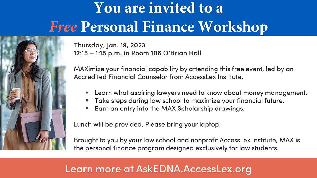 On Thursday, January 19th from 12:15-1:15PM, join OSA & AccessLex for a Welcome to MAX overview and financial planning information for law school students event in 106 O'Brian Hall. In this session, you will learn about the free online learning center, set up your MAX account, and be entered into AccessLex's scholarship drawing.