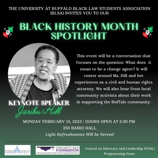 BLSA invites you to a conversation that focuses on the question: What does it mean to be a change agent? It will center around Ms. Jaribu Hill and her experiences as a civil and human rights attorney. We will also hear from local community activists about their work in supporting the Buffalo community.