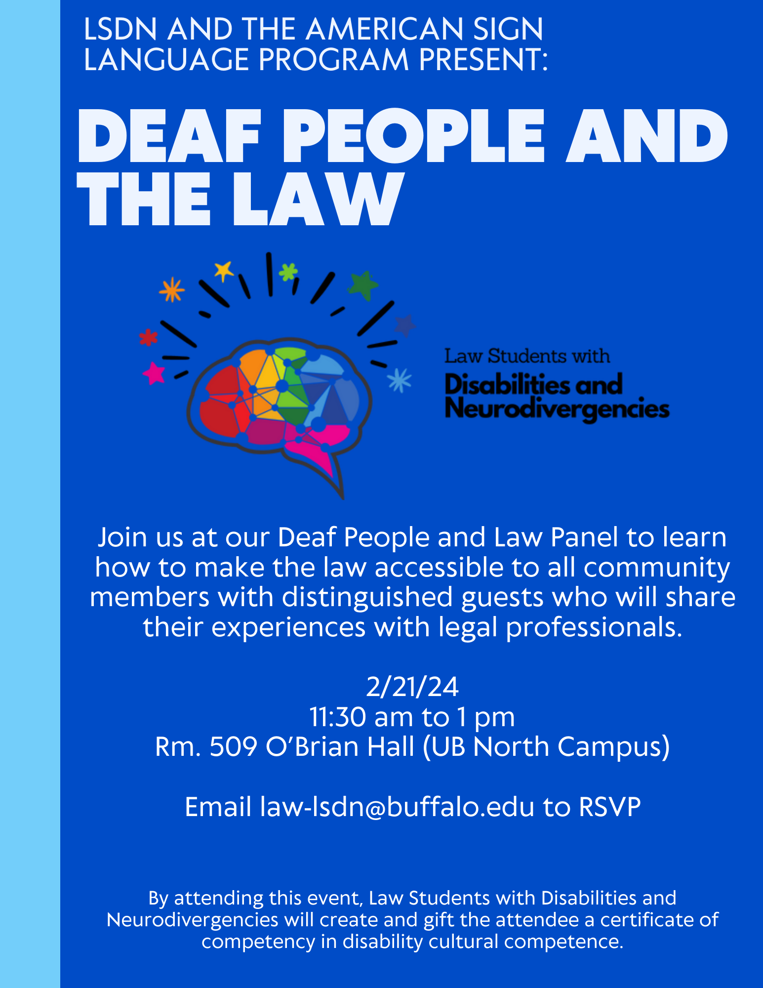 Join Law Students with Disabilities and Neurodivergencies to hear from Deaf individuals sharing their experiences with legal professionals. We will be offering a disability cultural competency certificate. A Zoom option will also be available.