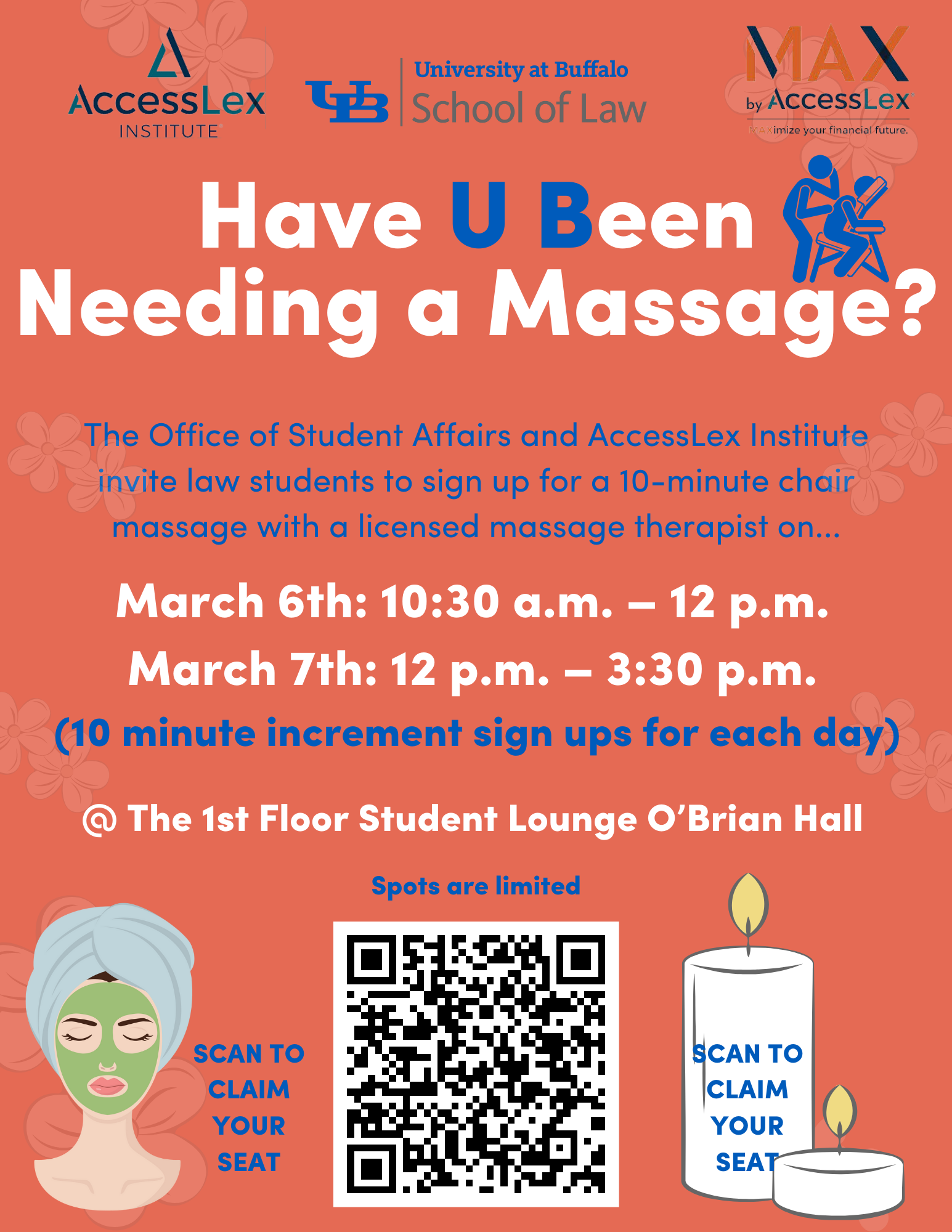 The Office of Student Affairs and AccessLex invite you to participate in their upcoming Wellness Events on March 6th & 7th. Please see attached flyers to sign up and for more details!