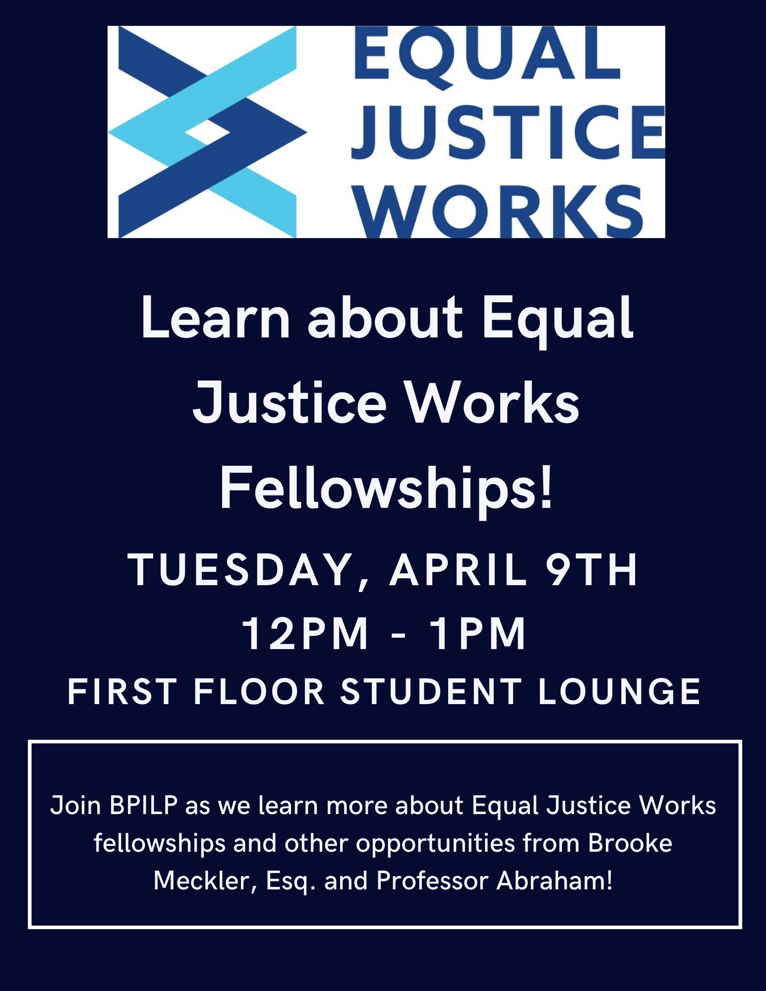 Bring your lunch on April 9th at 12 pm in the first floor student lounge, and join Brooke Meckler, Esq. of Equal Justice Works, a national nonprofit working to connect students with legal services organizations and other public interest opportunities, to learn more about how you can jump-start your public interest career!