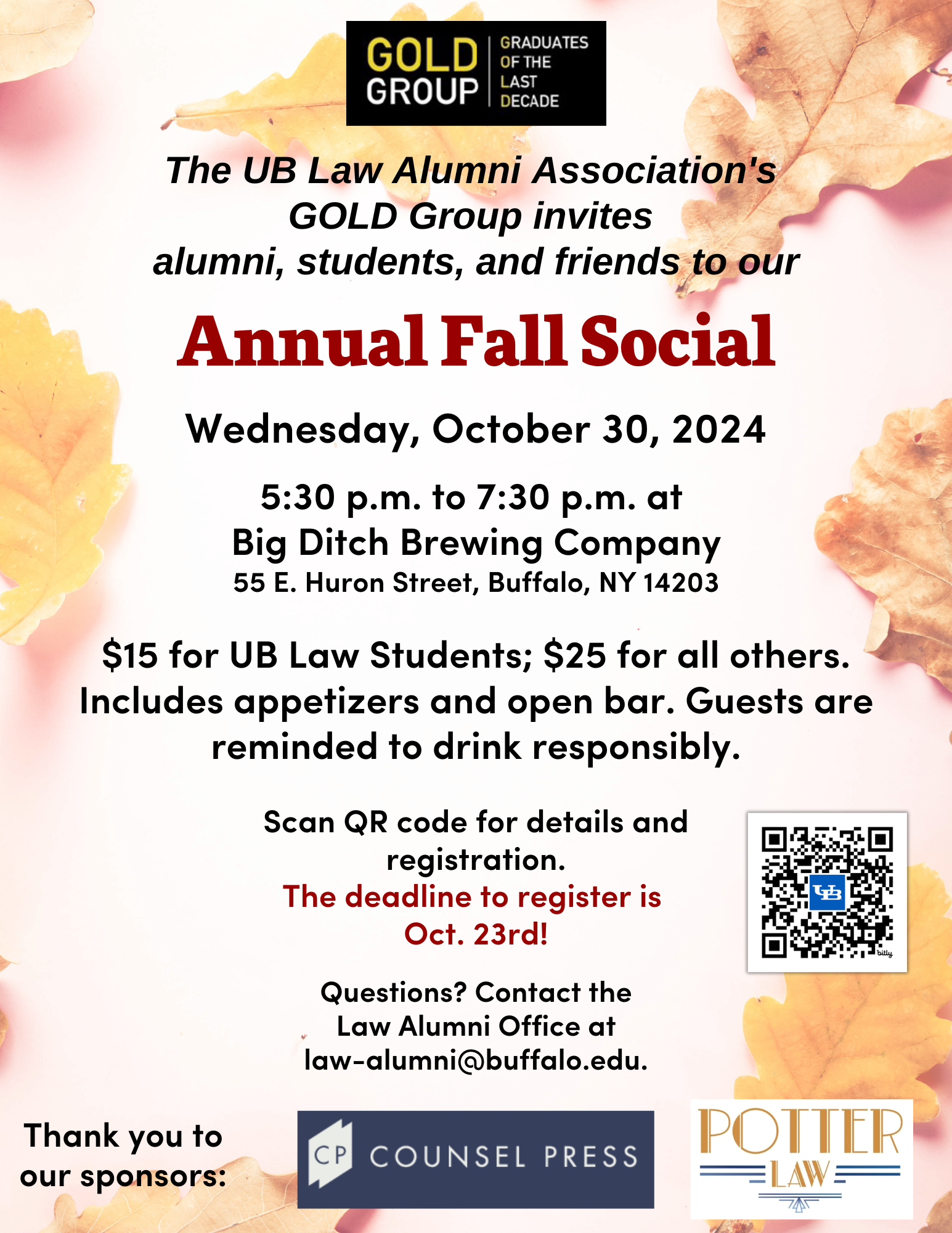 Come network and socialize with fellow students and members of the alumni community at the GOLD Group's annual fall social!