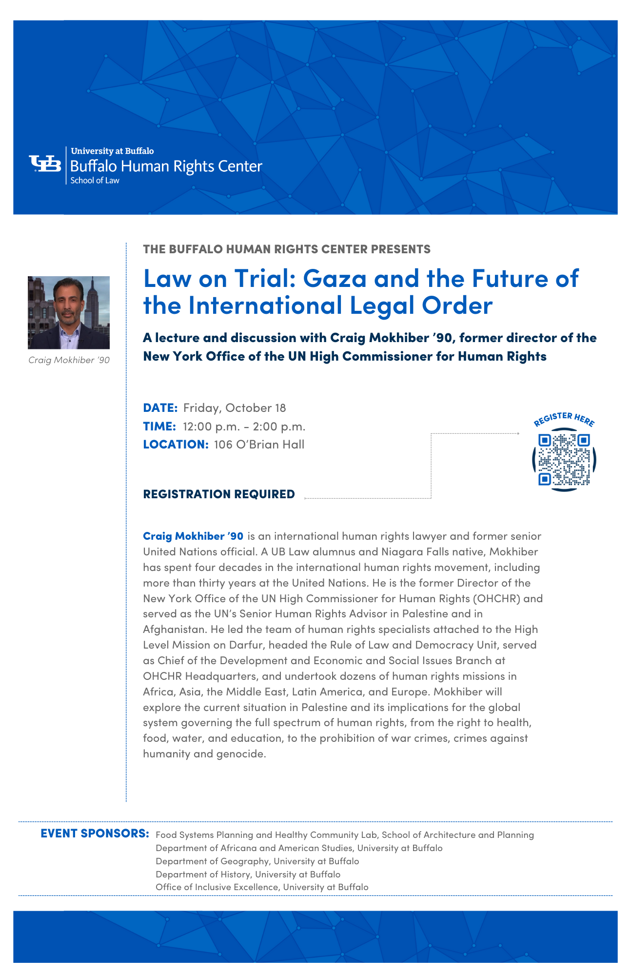 Craig Mokhiber is an international human rights lawyer and former senior United Nations official. A UB Law alumnus and Niagara Falls native, Mokhiber has spent four decades in the international human rights movement, including more than thirty years at the United Nations. He is the former Director of the New York Office of the UN High Commissioner for Human Rights (OHCHR) and served as the UN’s Senior Human Rights Advisor in Palestine and in Afghanistan. He led the team of human rights specialists attached to the High Level Mission on Darfur, headed the Rule of Law and Democracy Unit, served as Chief of the Development and Economic and Social Issues Branch at OHCHR Headquarters, and undertook dozens of human rights missions in Africa, Asia, the Middle East, Latin America, and Europe. Mokhiber will explore the current situation in Palestine and its implications for the global system governing the full spectrum of human rights, from the right to health, food, water, and education, to the prohibition of war crimes, crimes against humanity and genocide.
