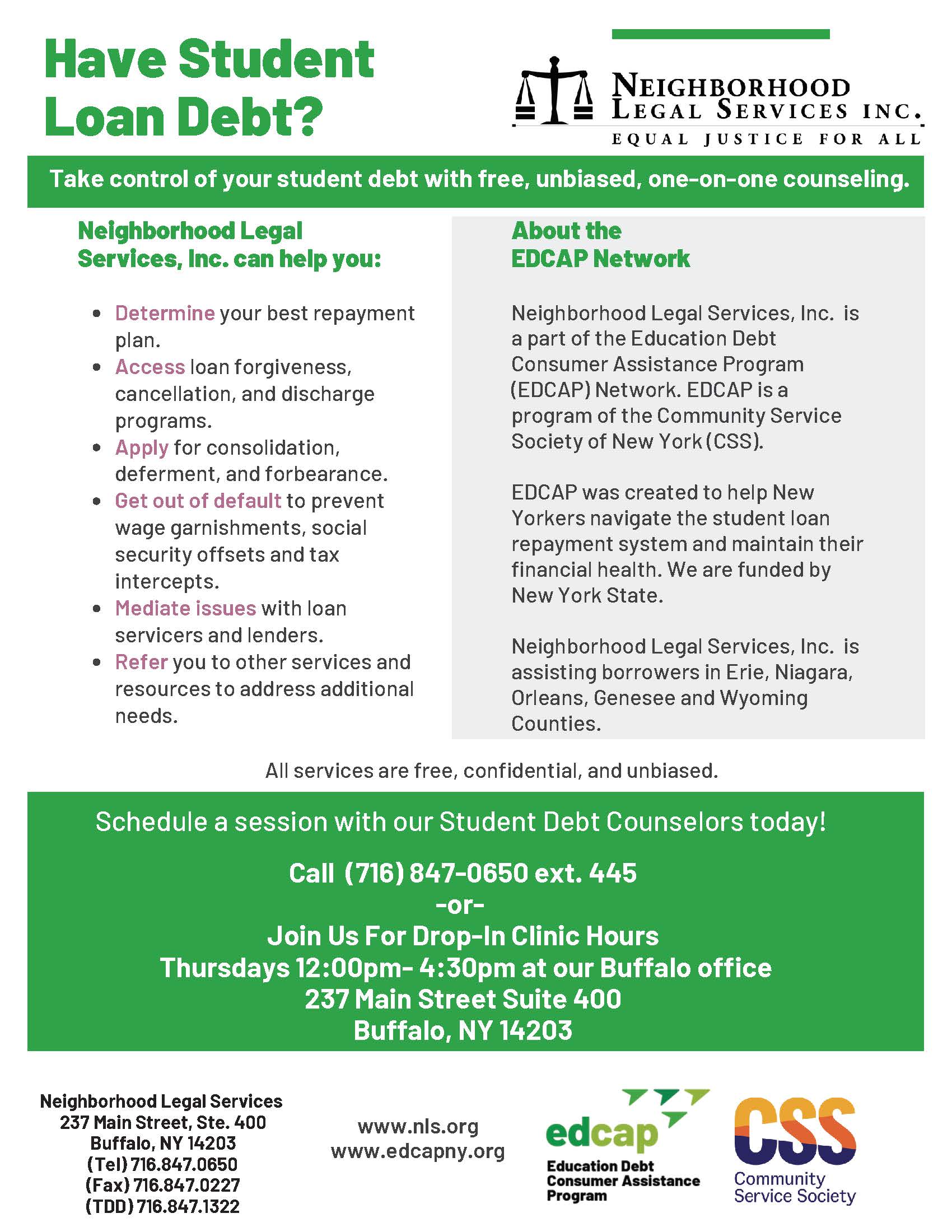 NLS is a not-for-profit public interest firm providing free civil legal services to primarily low-income individuals and families in Western New York. NLS is a part of the Education Debt Consumer Assistance Program (EDCAP) that was created to help New Yorkers navigate the student loan repayment system and maintain their financial health. With EDCAP funding, they accomplish their mission by providing direct counseling services, conducting workshops, presentations and implementing outreach and educational campaigns on relevant student debt topics.