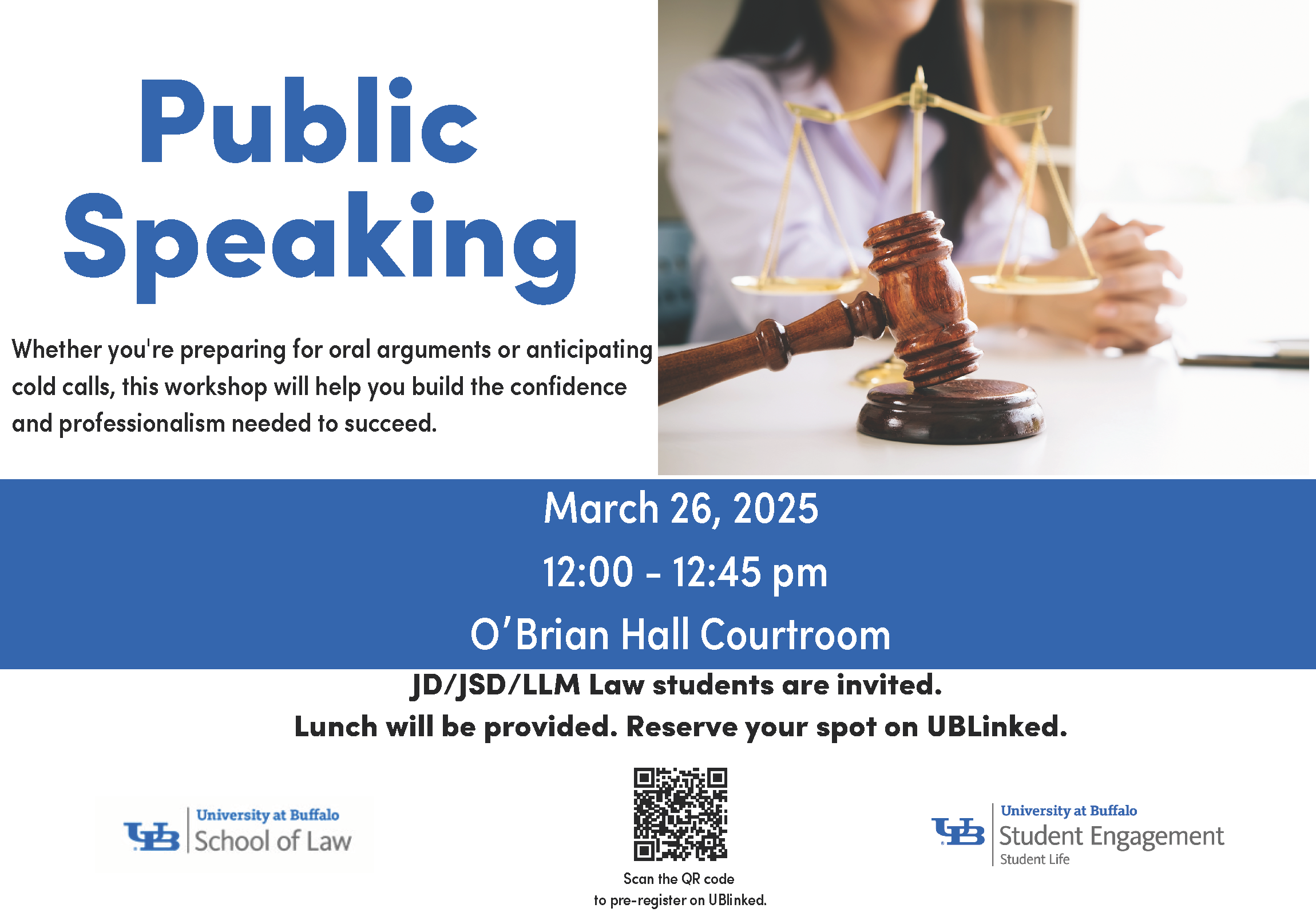 Whether you're preparing for oral arguments or anticipating cold calls, this workshop will help you build the confidence and professionalism needed to succeed. Through practical exercises and expert tips, you'll learn how to handle speaking challenges with poise and clarity. Join us to sharpen your public speaking skills and gain valuable strategies for excelling in law school and beyond.