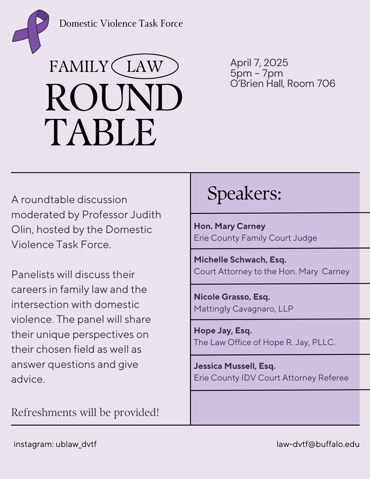 On Mon 4/7/2025 5:00 PM - 7:00 PM n O'Brian 706, join the DVTF for a roundtable discussion about different the careers paths in family law, that deal specifically with domestic violence. Panelists will discuss their career experiences and involvement with domestic violence and family law. The panel will share their unique perspectives on their chosen field as well as answer questions and give advice.