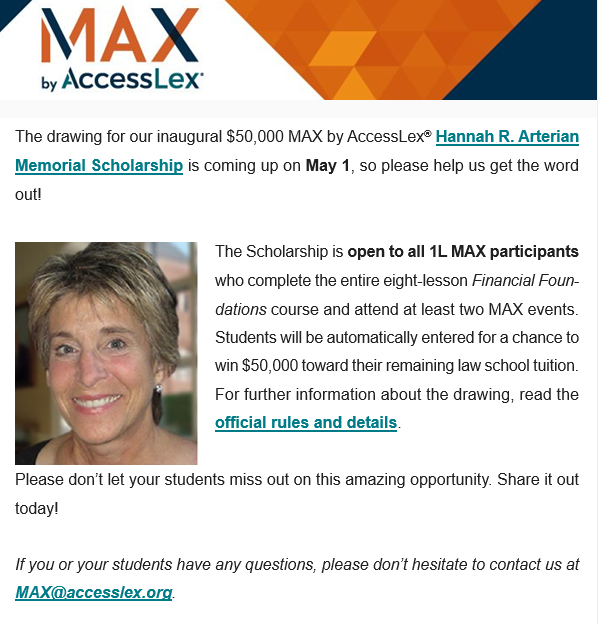 On May 1, one 1L student will be awarded the $50,000 Hannah R. Arterian Memorial Scholarship. To be entered for the drawing, you must have completed all eight online lessons/activities in your MAX by AccessLex® Financial Foundations course and attend at least two webinars.