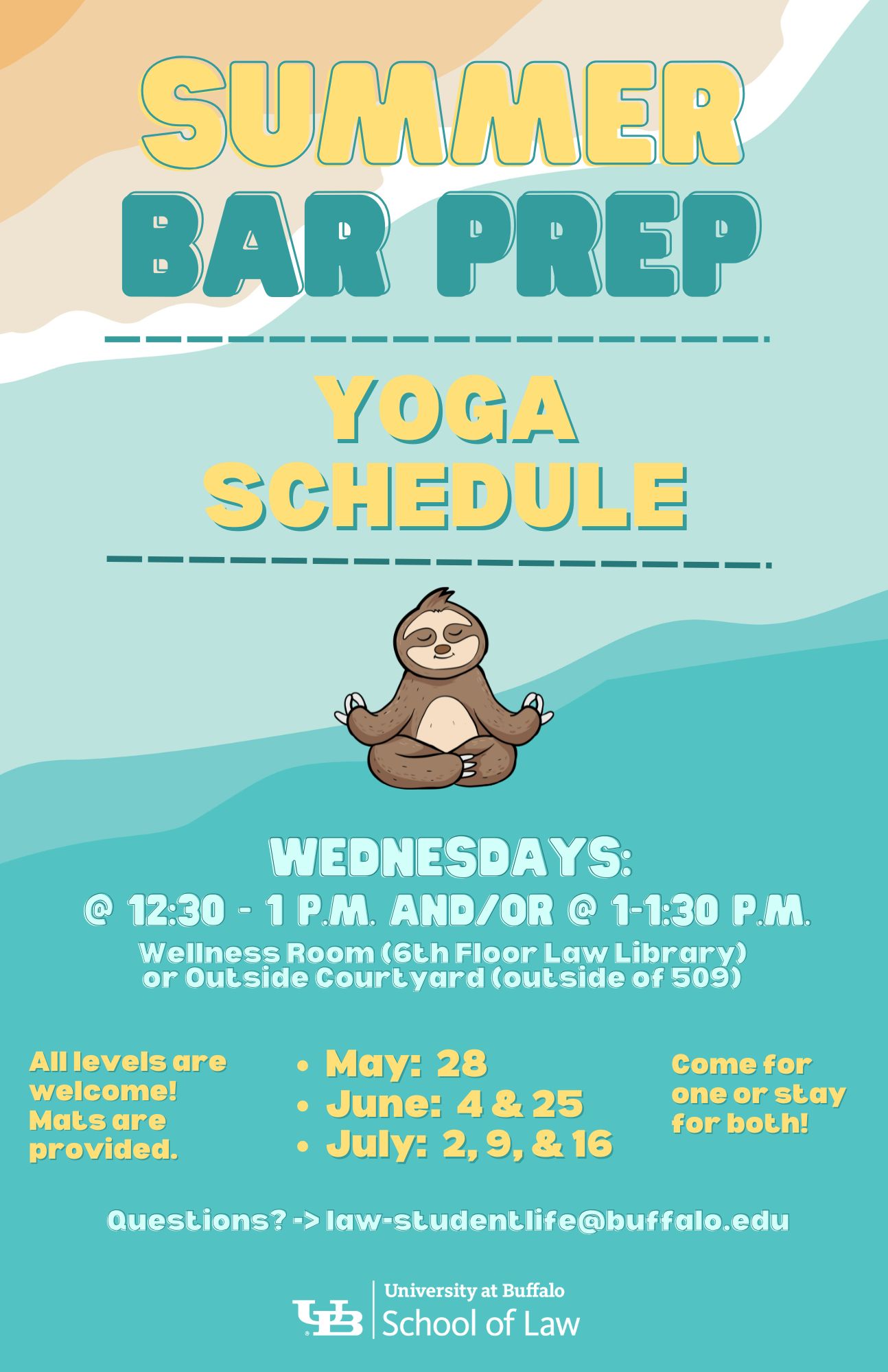 Ashley Abbott will also be teaching yoga to those preparing for the bar on select Wednesdays between 12:30-1 and/or 1-1:30 p.m. in the 6th Floor Law Library Wellness Room. Please see attached flyer for dates. Many of the Class of 2024 yoga participants found class to be extremely helpful as they studied for the bar over the summer and even attributed the yoga break to performing better on afternoon sets of questions.