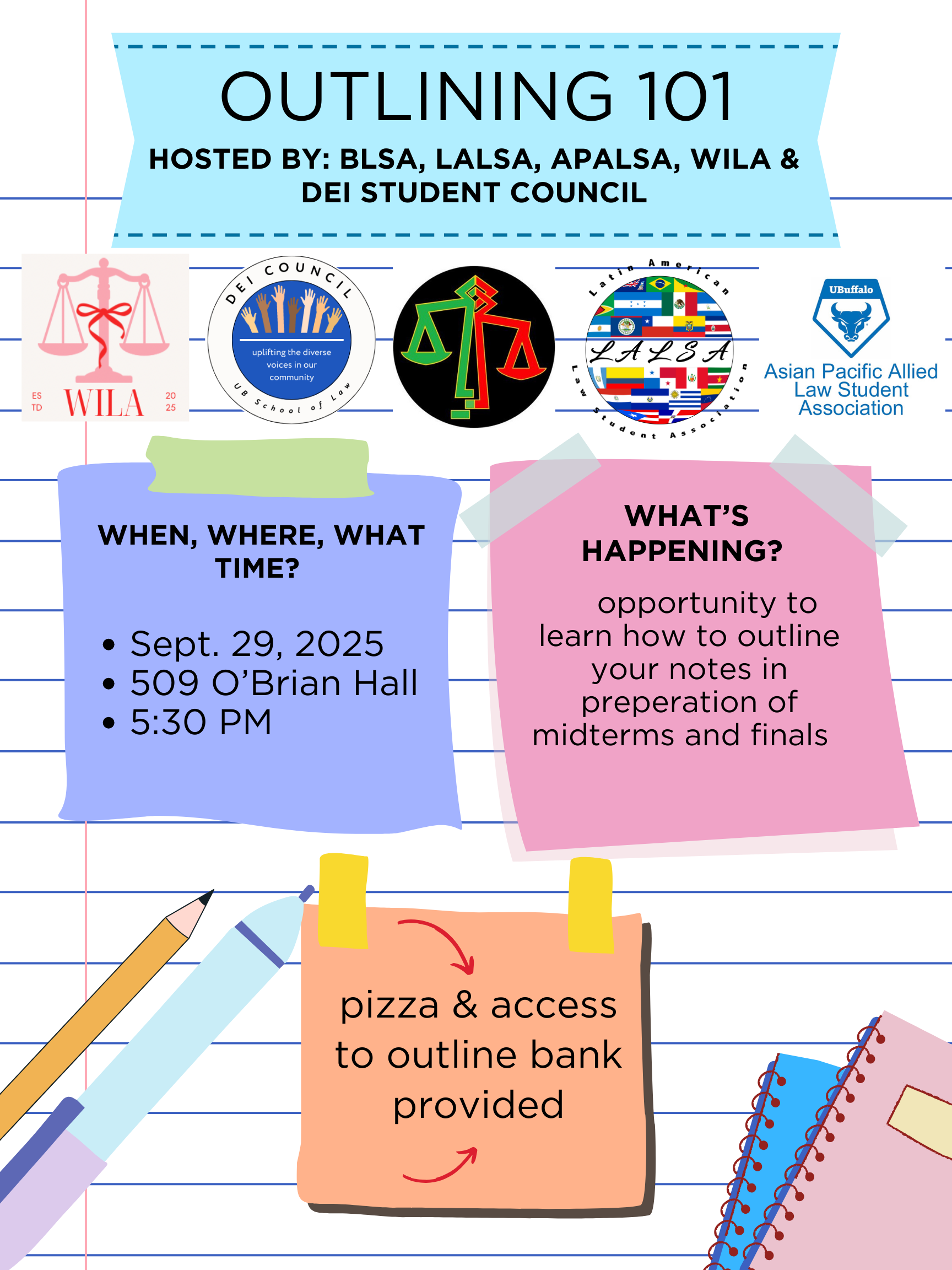 TODAY, Monday, September 29, between 5:30 pm to 7 pm, BLSA, APALSA, LALSA, WILS & DEI will be hosting an outline review and preparing students for upcoming exams with best practices and tips in O'Brian 509.