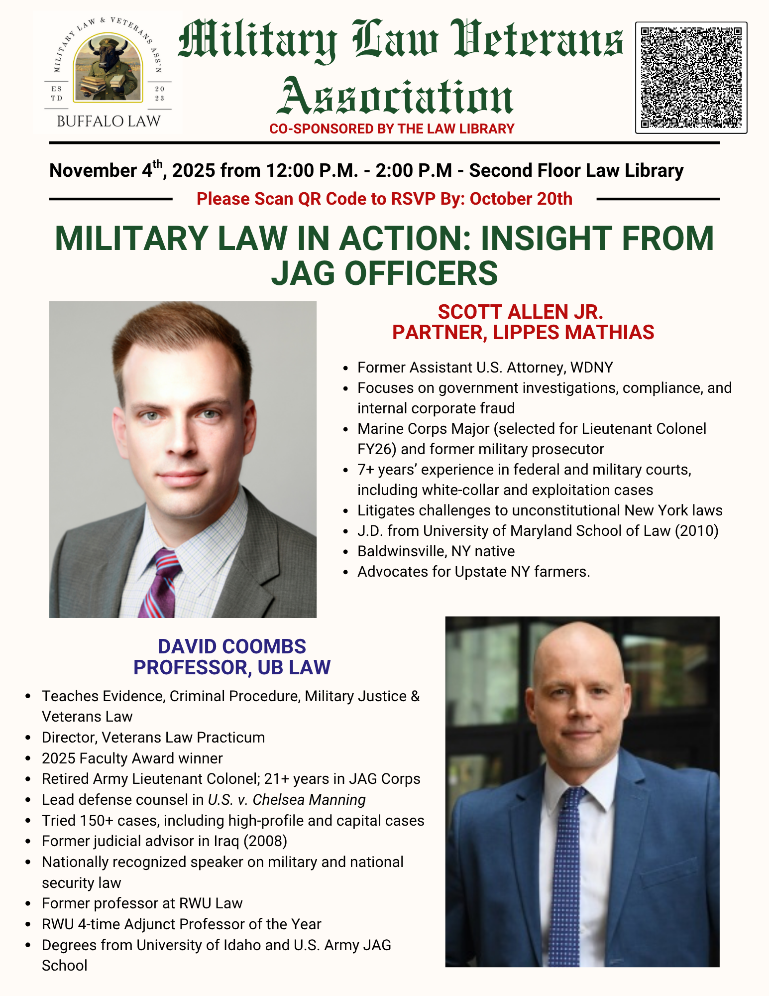 Scott Allen from Lippes Mathias will speak to the MLVA. Scott is also a JAG officer with the Marine Corps Reserves. Professor Coombs will also be a guest speaker. Open to all law students.