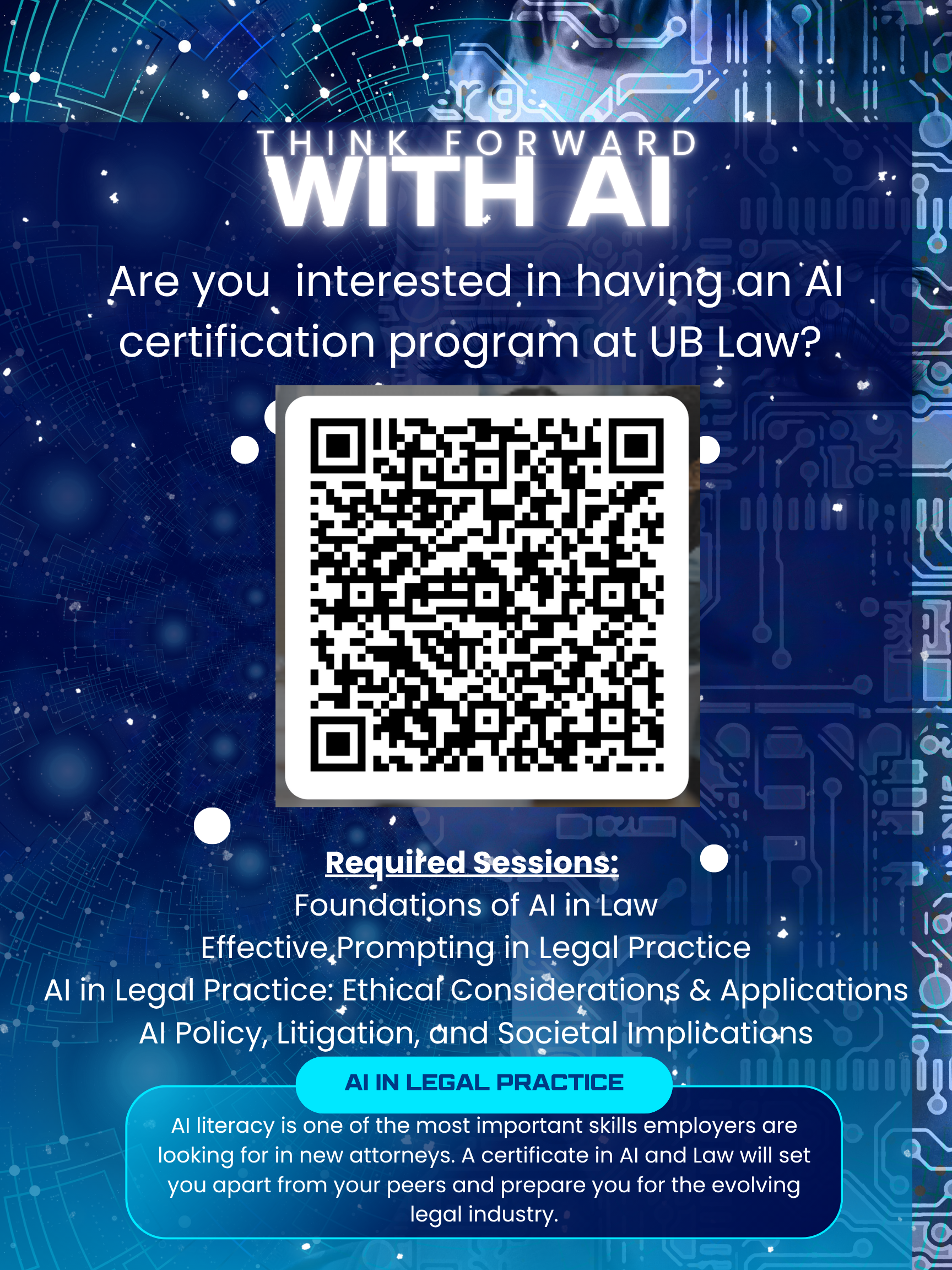 The Law Library is considering an AI Certification Course at UB. AI literacy is one of the most important skills employers are looking for in new attorneys. A certificate in AI and Law will set you apart from your peers and prepare you for the evolving legal industry. Is this something you are interested in having at UB?