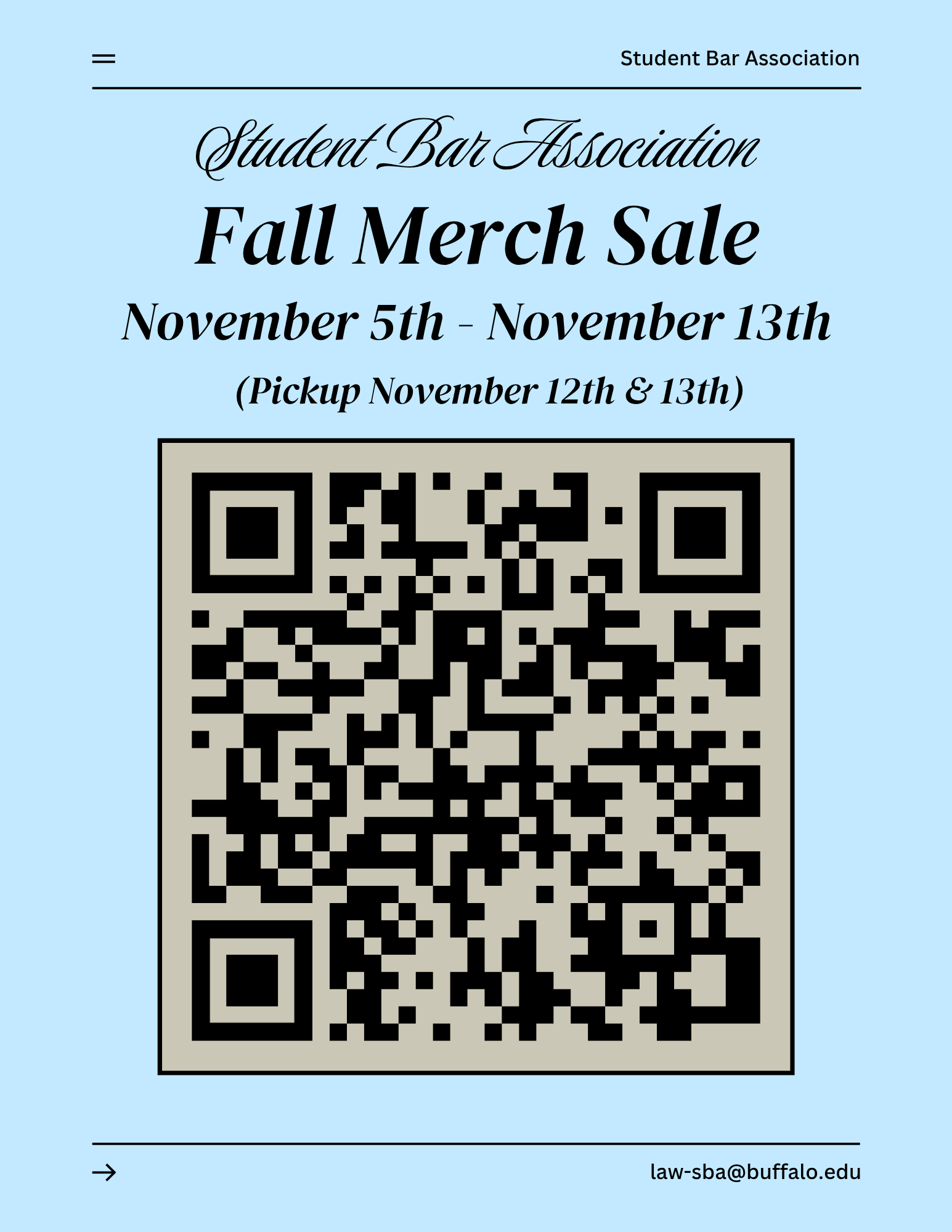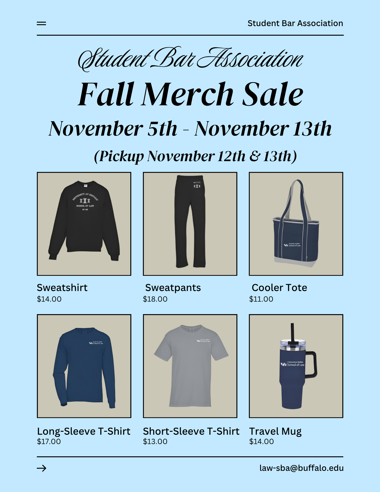 Come pick up your pre-ordered law school merchandise in room 202 of O'Brian Hall from 9:00 AM to 4:00 PM on Wednesday, November 13th, and Thursday, November 14th!