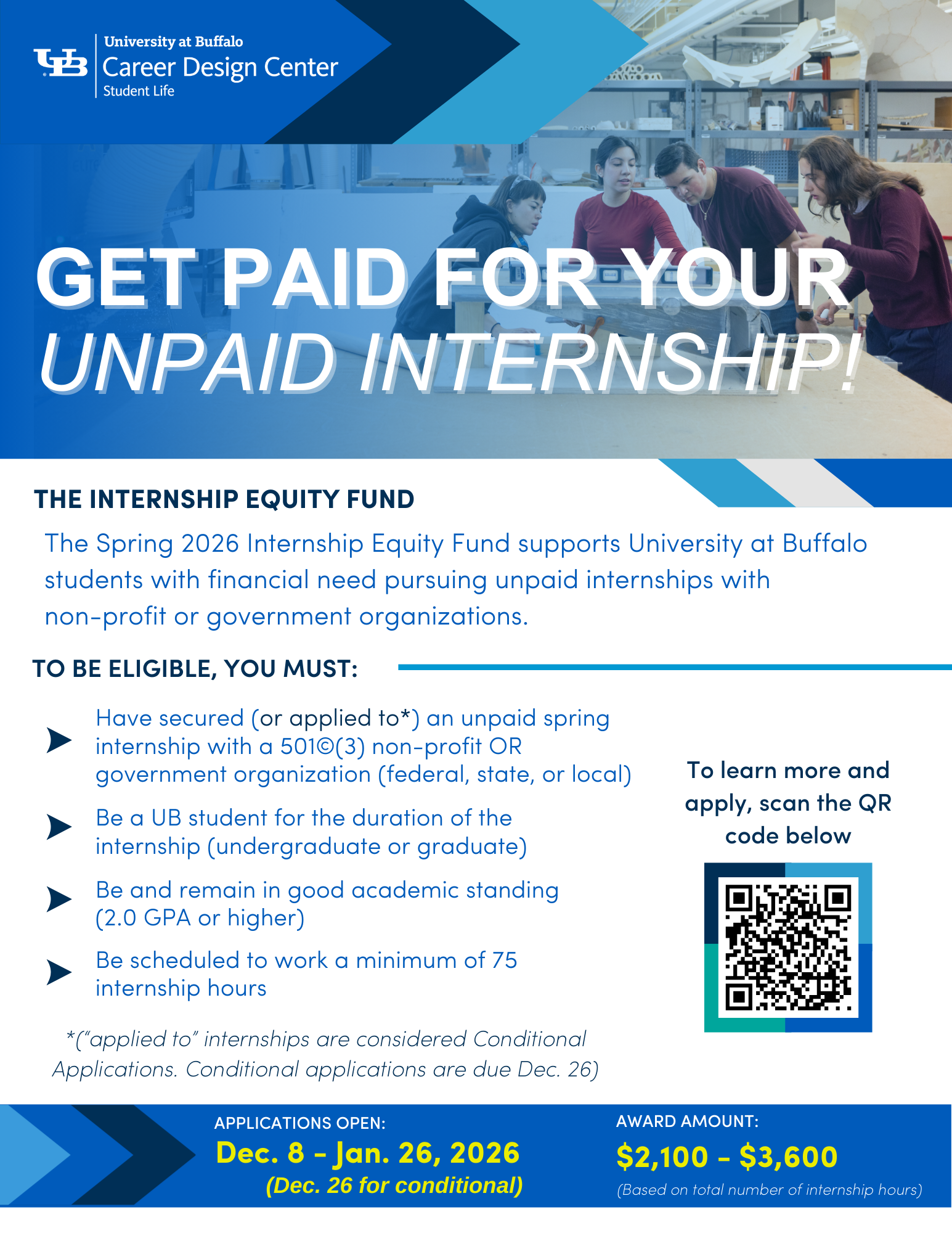 Spring 2026 Internship Equity Fund is officially accepting applications in the UB Scholarship Portal through January 26! As a reminder, this funding opportunity is for actively enrolled University at Buffalo students who are pursuing unpaid spring internships with non-profit or government organizations and have a demonstrated financial need.