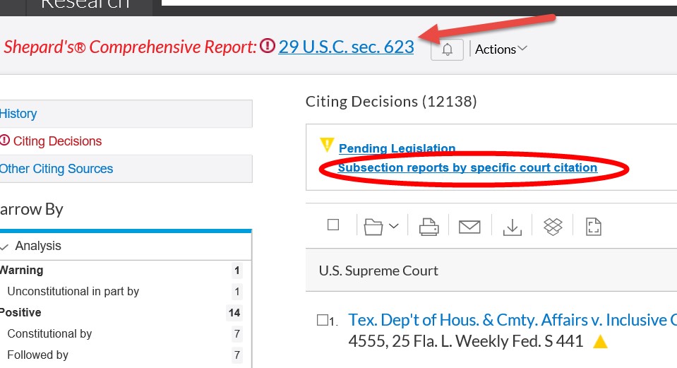 For example, you know that 29 U.S.C. 623(b) is the statute prohibiting age discrimination by employment agencies and you pull it up on Lexis Advance. When you first click on Shepardize the statute, you find that there are over 12,000 decisions that cite to the entire section, i.e. 29 USC 623. Needless to say, many more cases than you can or want to review. But, if you click on Subsection reports by specific court citation and scroll down to sec. 623(b), there are only 106 cases. It makes your research both more precise and efficient!