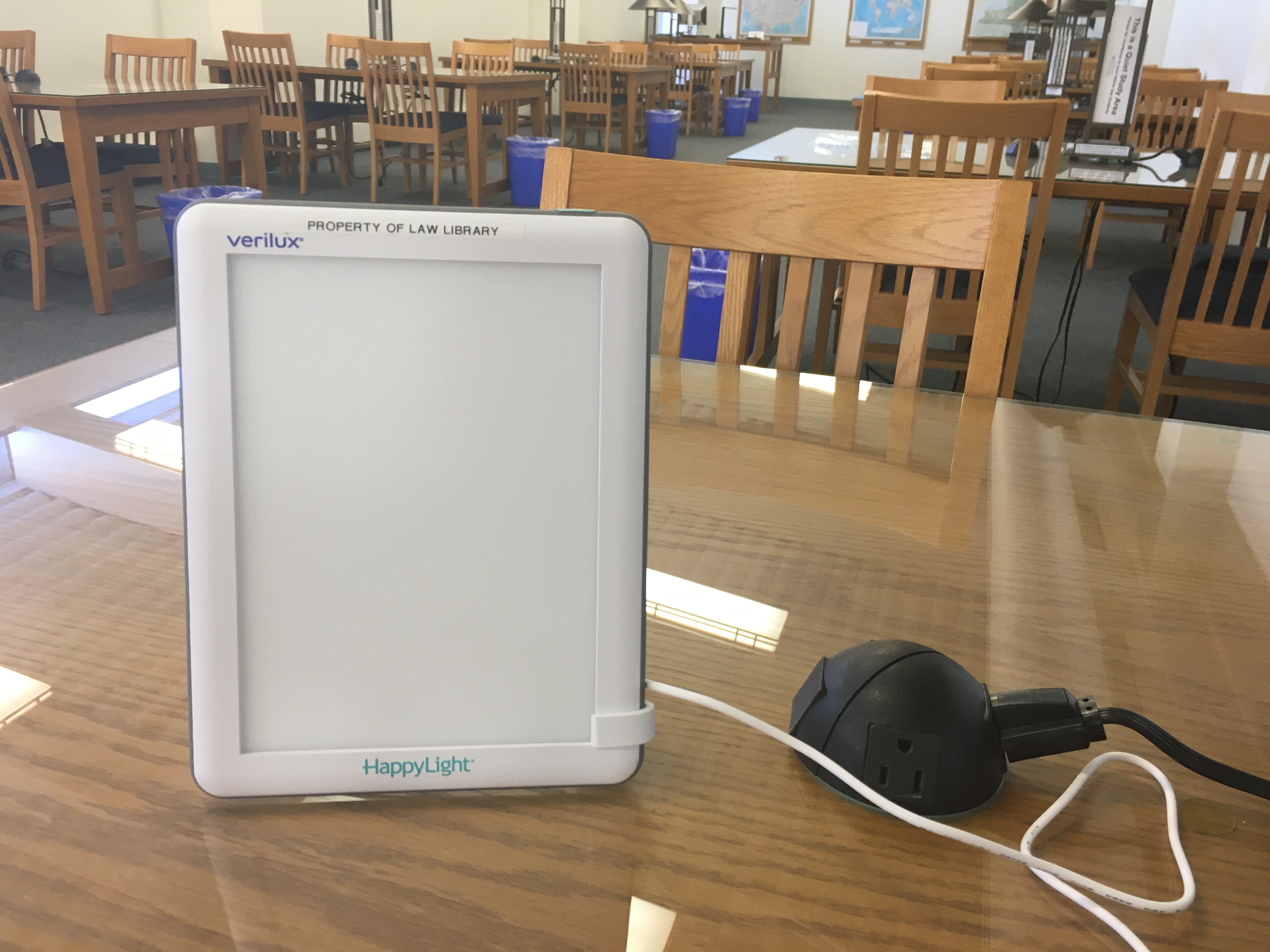 The Law Library has added a "Happy Light" to both the 5th and 7th floor reading rooms. They are supposed to help boost your energy and mood during our gloomy winter months. Please give them a try and let me know what you think! If they are popular, we can always buy a few more. (The directions for using them are taped to the back, but essentially just place the light 12-18" from your face outside of your direct line of sight.)