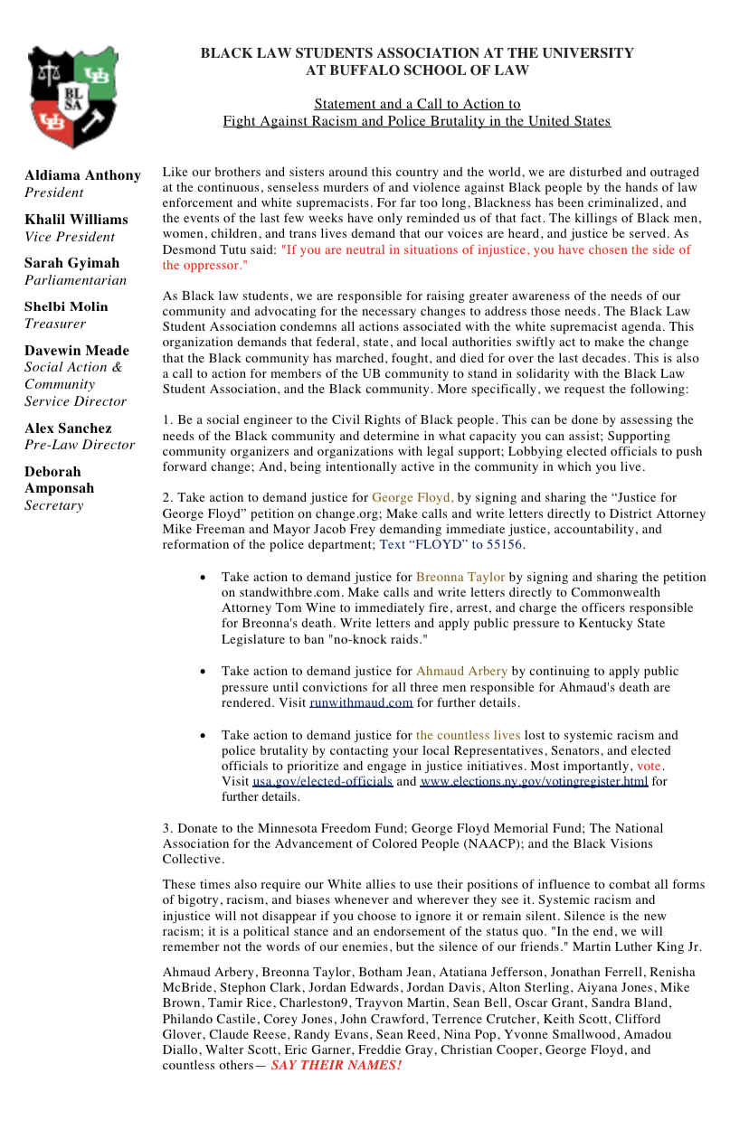 Please see attached for the official statement & call to action from the Black Law Student Association at the University at Buffalo School of Law -