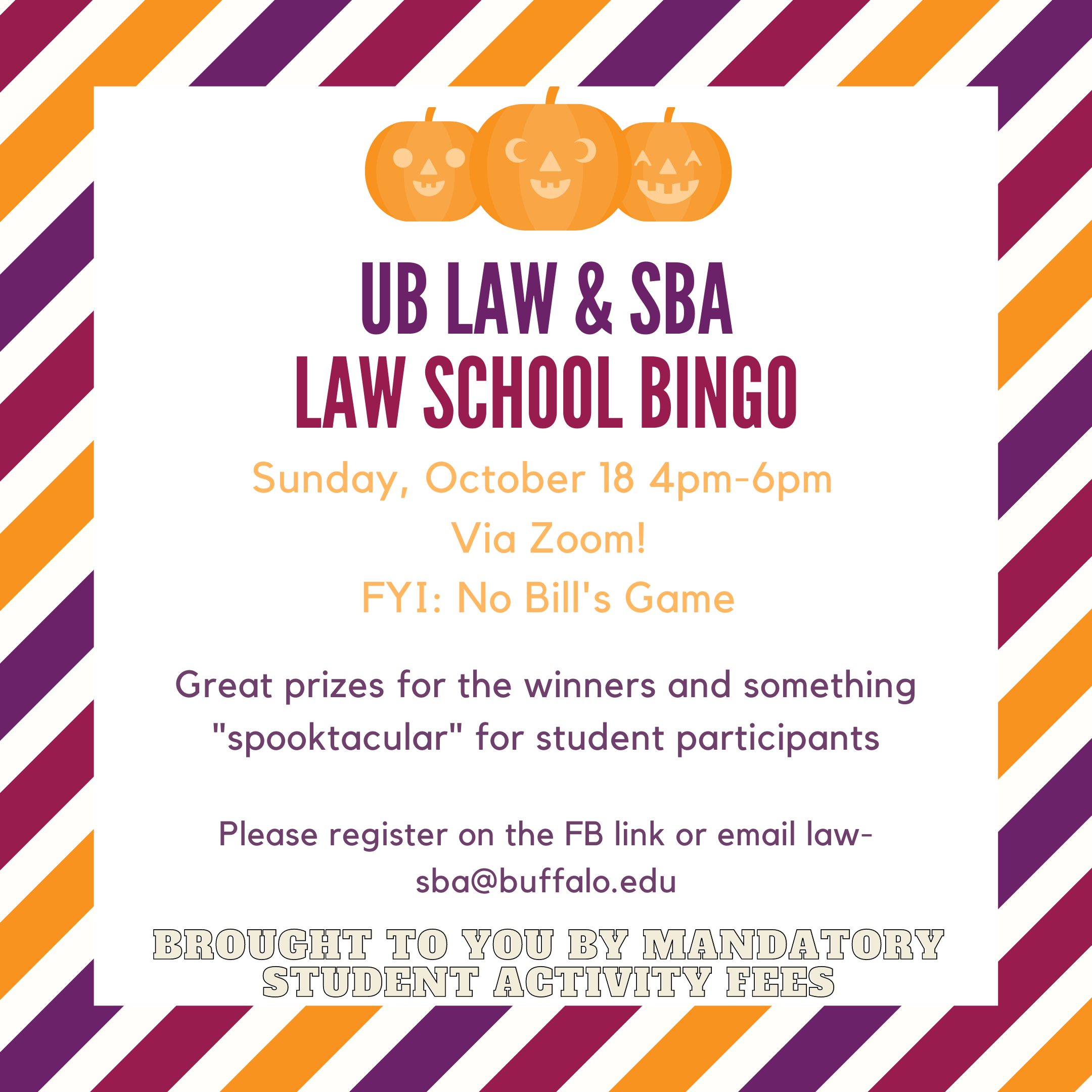 Please register by emailing law-sba@buffalo.edu or on the Facebook event that will be posted on all the class pages.
