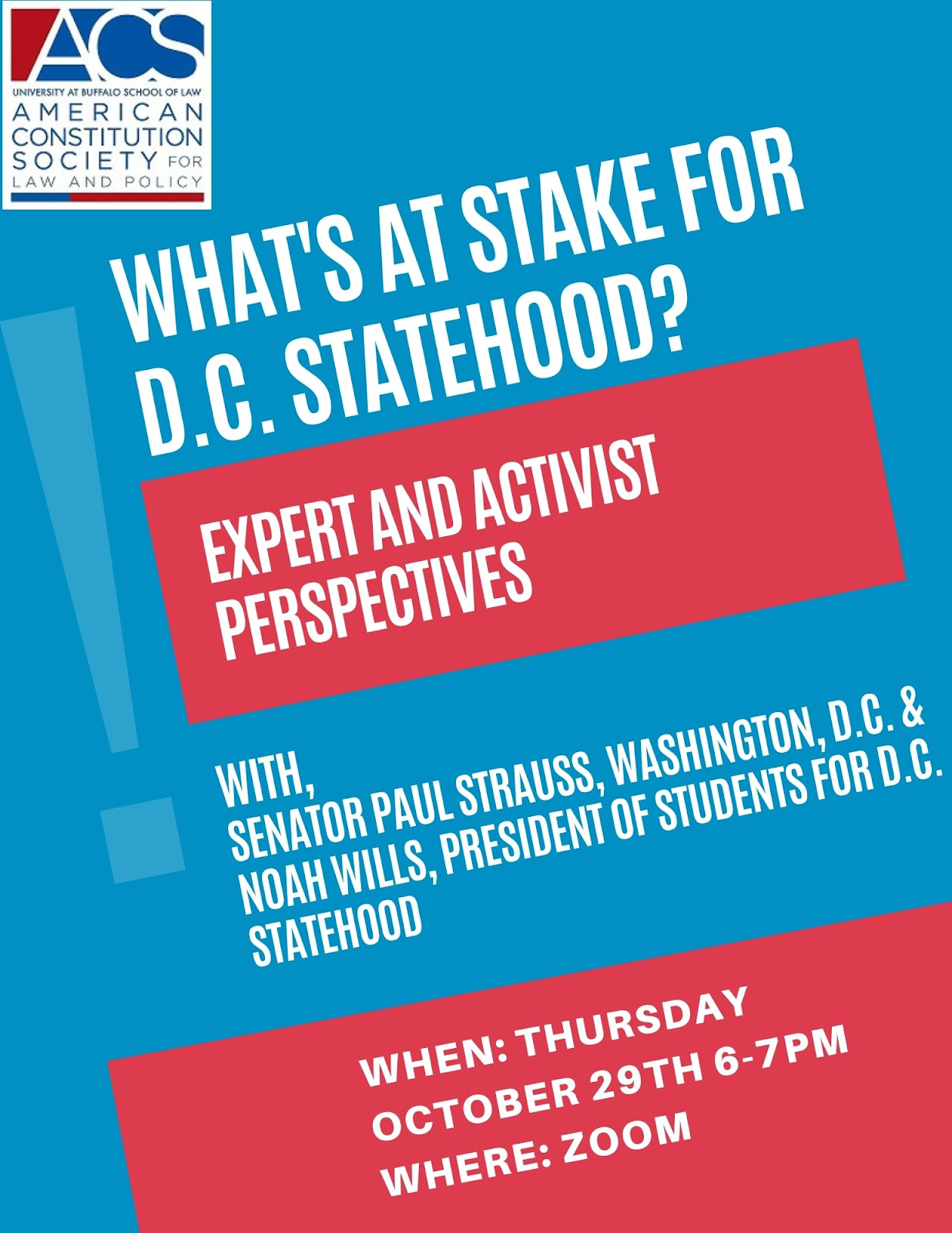 Please join UB Law’s American Constitution Society on Thursday October 29th from 6-7pm for our virtual panel, 'What’s at Stake for D.C. Statehood?: Expert and Activist Perspectives.'