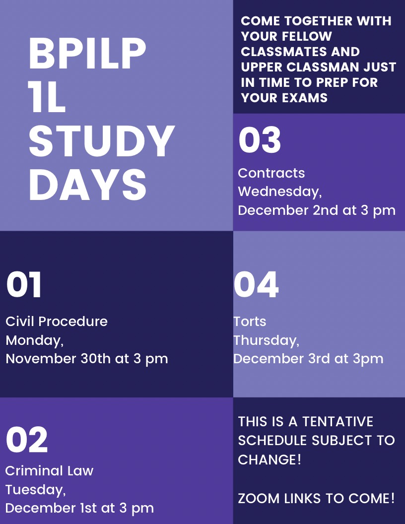 This reading week, join BPILP for 1L Study Days! We know how difficult it has been to connect and form study groups this semester, so we wanted to provide an opportunity for students to meet new people and study! We will also have 2L and 3Ls available to speak on study tips and our personal exam preparation methods. Please take a minute to complete our form https://forms.gle/jPhRfzvuzCaVn75z8 if you are interested in joining. We have also made accommodations for those students who are unable to join during the allotted time. We look forward to seeing you all there!