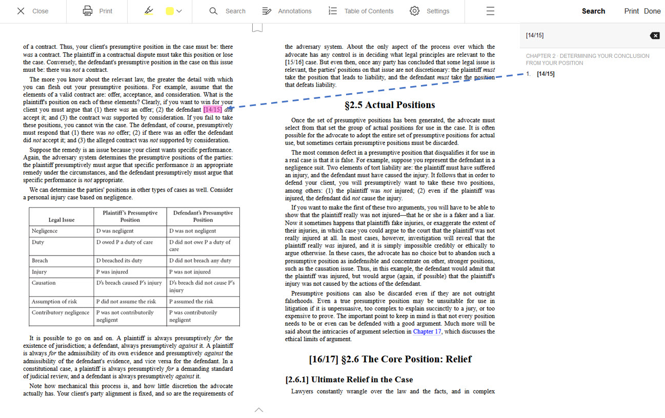Several of the links in the guides above will take you to our LexisNexis Digital Library subscription. Since the pagination in the Digital Library typically differs from the pagination in the corresponding print titles, the publisher told us about a workaround where you can search for print pages using brackets. Here is an image showing how to search for the start of print page 15 in an eBook: