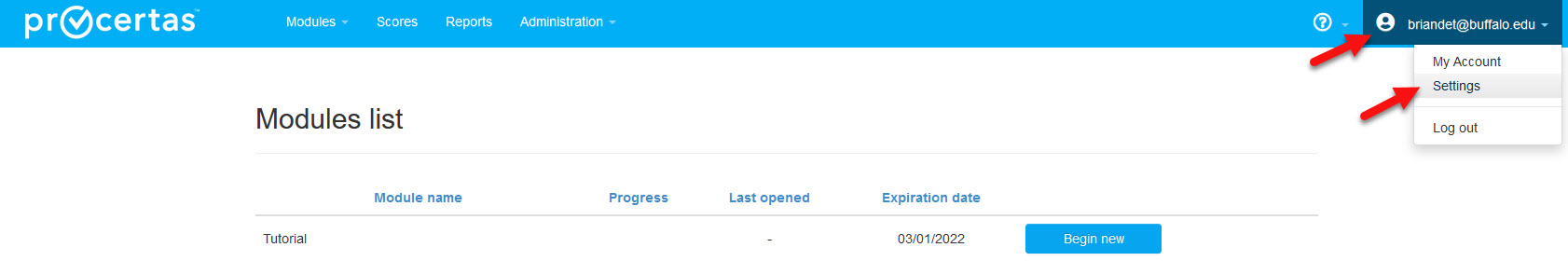 **Mac users, if you need to change the operating system, please click on the Settings option that appears when you hover your cursor over your email address in the top right corner of the Modules page**