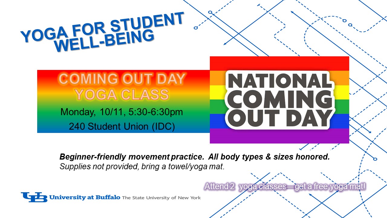 • Monday, 10/11 Coming Out Day yoga event--co-sponsored with, and being hosted in, the IDC (SU 240) from 5:30-6:30pm. This event is for students who identify as LGBTQ+, as well as allies, to celebrate national Coming Out Week. All students are welcome and invited. It is a gentle yoga practice and no yoga experience is necessary.
