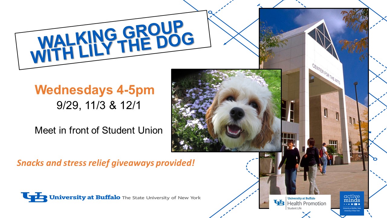 • Wednesday, 11/3 Monthly Walking Group with Lily the Dog--from 4-5pm, meeting in front of the Student Union. Step outside and enjoy a self-care break with Lily, the therapy dog. Boost your energy, improve your mood and connect with other students while you explore new areas of campus. Snacks and free stress relief giveaways provided. Co-sponsored by Active Minds SA Club.