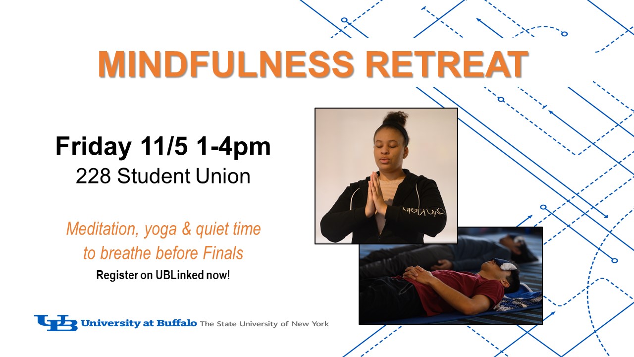 • Friday, 11/5 Mindfulness Retreat—from 1-4pm in 228 Student Union. This is a program to slow down your busy, thinking mind. The theme for this semester’s retreat will focus on gratitude. The retreat includes mindfulness skill building, meditation instruction and practice time, yoga, snacks and plenty of quiet time. All experience levels welcome. If possible, please register for this event so we know how much food to bring. You can register on the Health Promotion forms page on UBLinked here: https://buffalo.campuslabs.com/engage/organization/wes