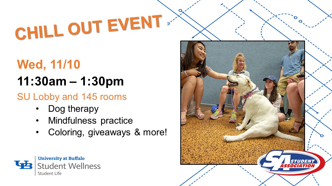 • Wed, 11/10 Chill Out Stress Relief Event—from 11:30am – 1:30pm in the Student Union lobby and 145 rooms. At the end of each semester Counseling Services, Health Services, Health Promotion and the undergraduate Student Association co-sponsor the Chill Out event to help students find healthier ways to relax and take care of themselves during Finals. The event includes: dog therapy, mindfulness practice, coloring, free giveaways and more. Chance to win raffle prizes of electric Shiatsu Neck/Back Massager, Tim Hortons gift card and more.