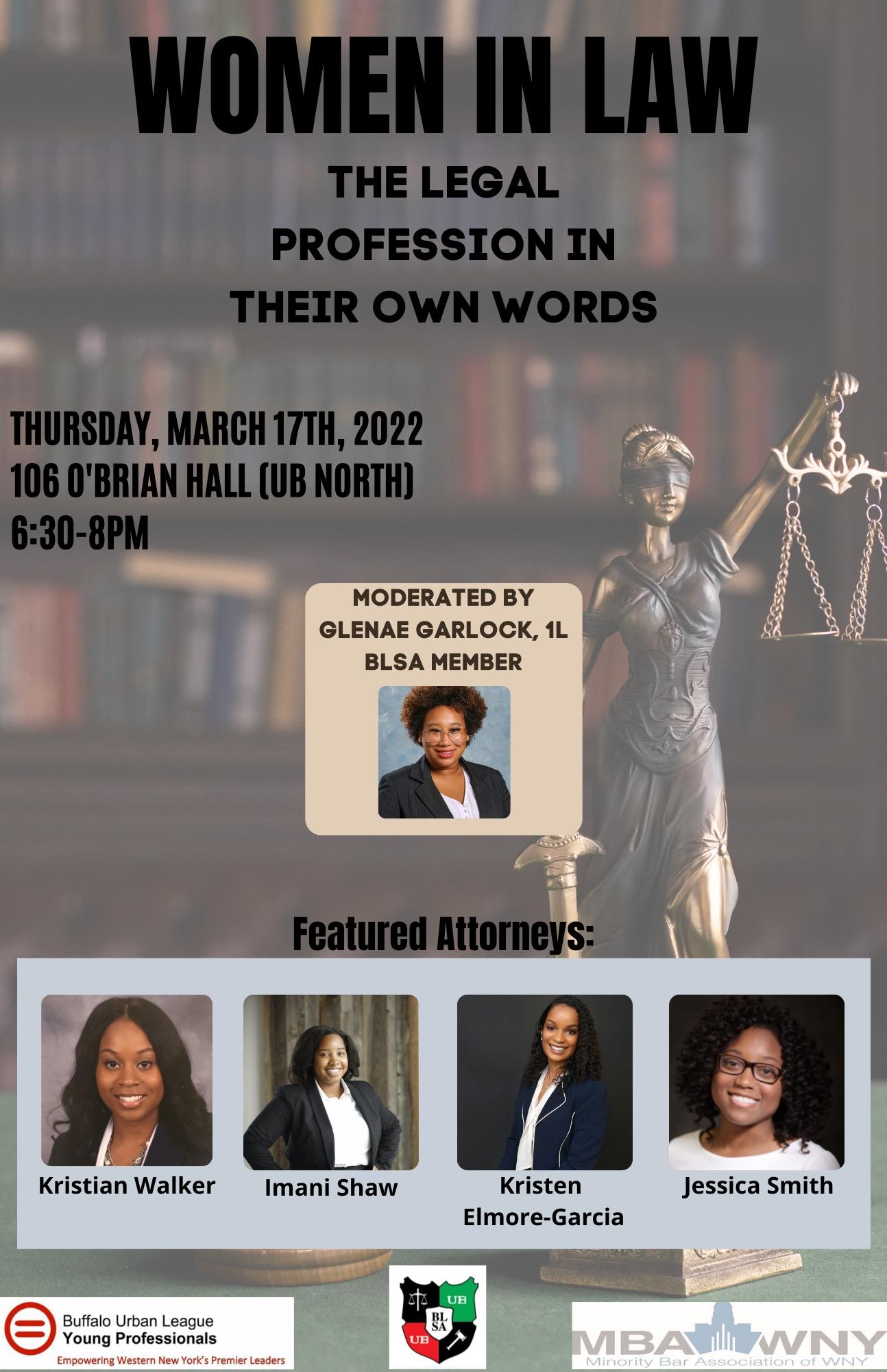 Join BLSA for a speaker panel discussion focused on the background, experiences, and insights into the legal profession from the perspective of Black women lawyers. Open to the public. Sponsored by BLSA and BULYPNY-Buffalo Urban League for Young Professionals NY