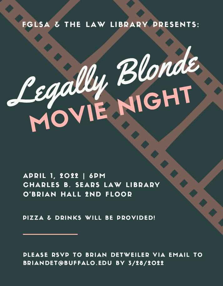 Just a reminder to join the First Generation Law Students Association for a Movie Night this Friday, April 1st at 6 PM in the Law Library! We will be watching Legally Blonde and enjoying some pizza and soft drinks. Please RSVP to me at briandet@buffalo.edu by Wednesday, March 30th if you would like to attend, so we can ensure we get enough food for everyone.