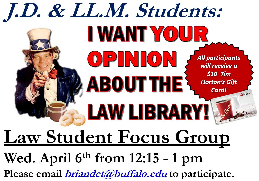 I just wanted to send along one more reminder about this Wednesday's Law Library Focus Group. We will be meeting in 543A for a very informal and totally anonymous discussion about our space and services. Please RSVP to me at briandet@buffalo.edu by this Monday, April 4th to participate so I can be sure to pick up enough Tim Horton's gift cards for all participants.