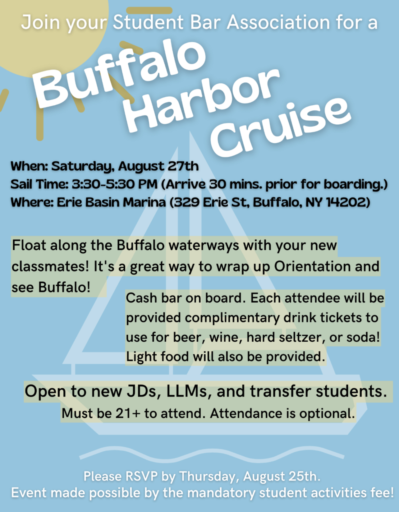 SBA is sponsoring a cruise for new students along the Buffalo Harbor. It is a great way to mingle with classmates and see the sights of the city! Light snacks and drink tickets for beer, wine, hard seltzer, and soda will be provided for each attendee.