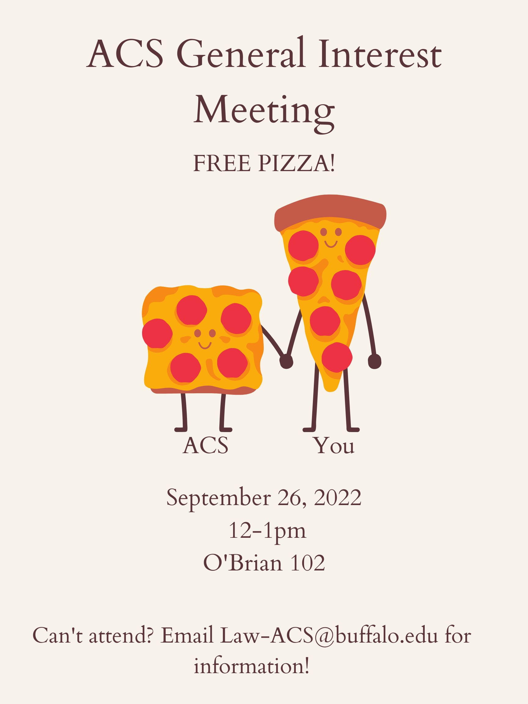 The American Constitution Society invites you to our Fall General Interest meeting. Come join us for free pizza and progressive legal conversation. If you cannot attend the event, feel free to email law-acs@buffalo.edu for membership information.