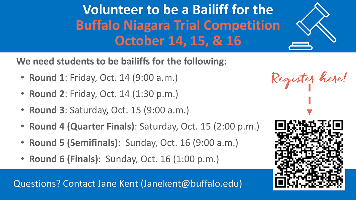 Thinking about joining Trial Team? Consider volunteering to be a bailiff for the Buffalo Niagara Trial Competition, to be held October 14-16. Being a bailiff gives students the chance to observe a trial competition prior to competing on their own.