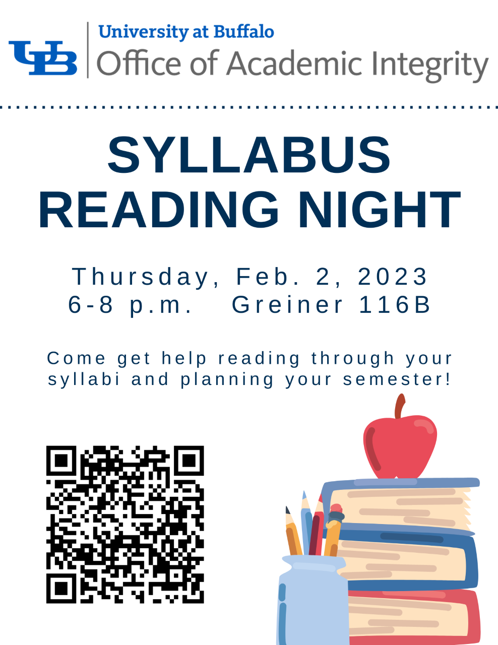 The Office of Academic Integrity is hosting a Syllabus Reading Night (flyer attached) to kick off the Spring semester. At this event, the Student Integrity Ambassadors will be available to work one-on-one or in small groups with students to identify important due dates (e.g., exams, projects, papers) throughout the semester and to break down the steps needed to successfully complete their requirements with integrity.