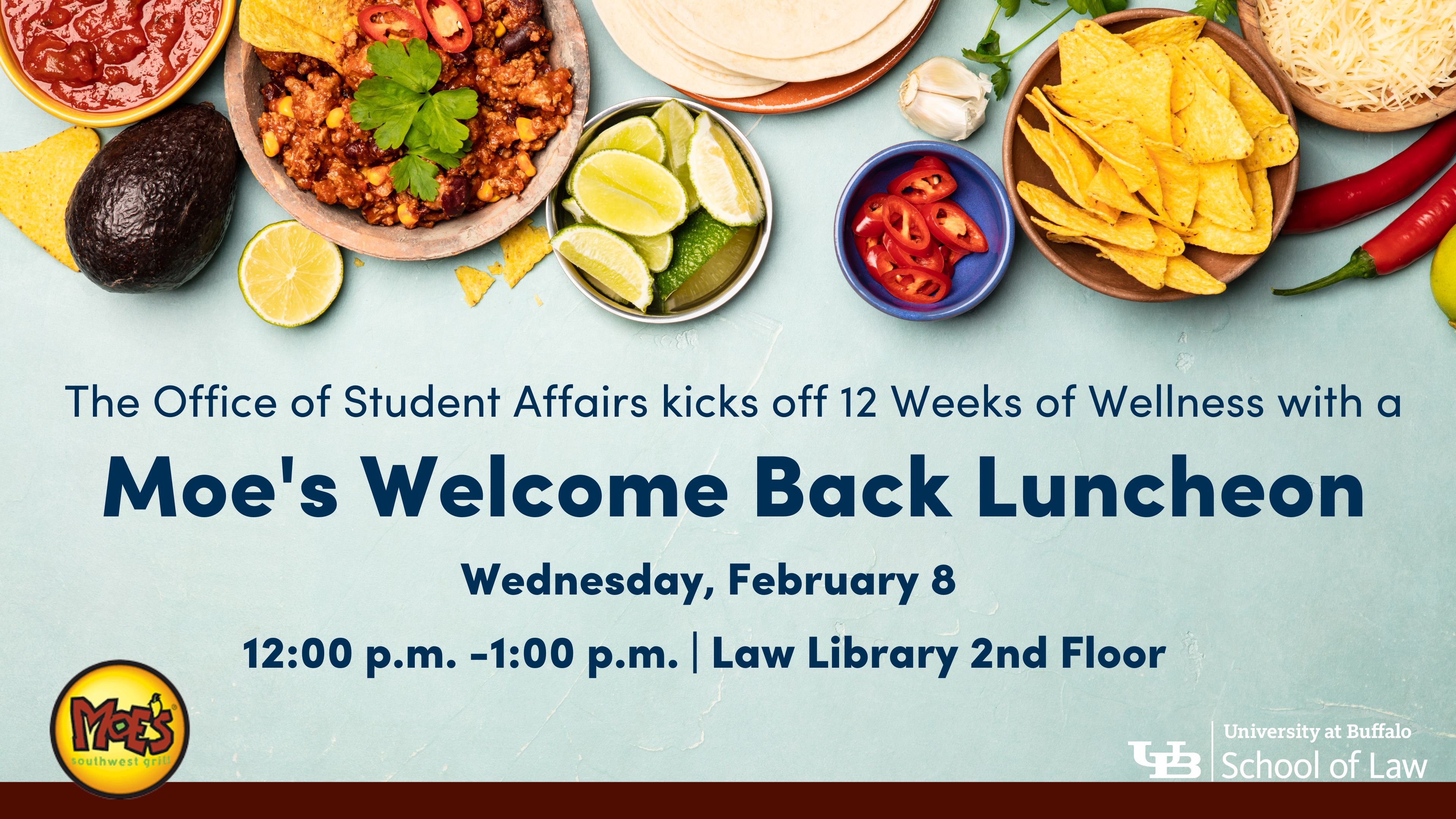 The Office of Student Affairs is kicking of 12 Weeks of Wellness with a Moe's Welcome Back Luncheon on Wednesday, February 8th from 12-1PM on the 2nd floor entrance of the Law Library! Come join us to eat, socialize, welcome everyone back, and kick of the 12 weeks of wellness for the spring semester!