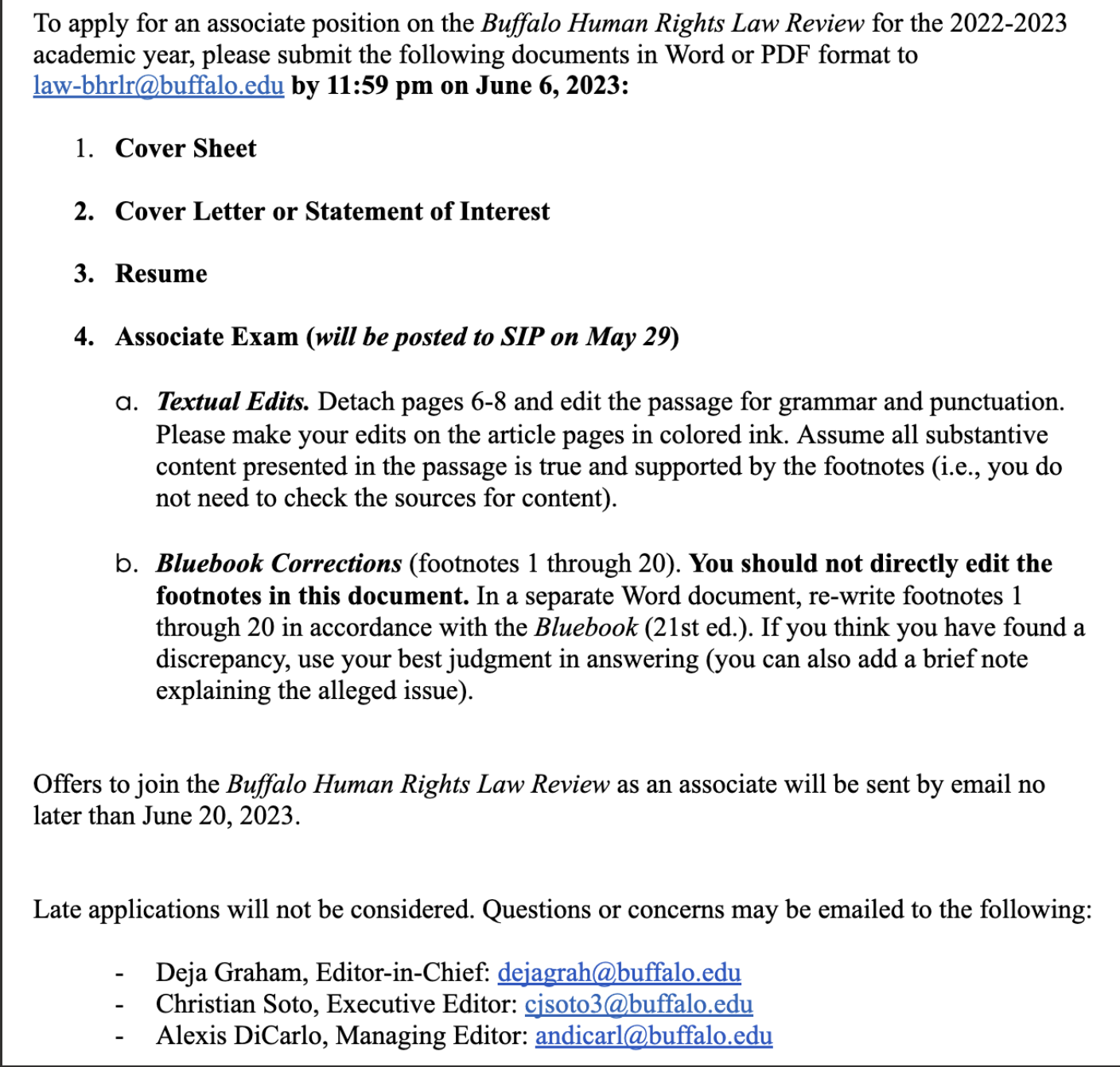 Buffalo Human Rights Law Review Application will be open from May 29-June 6. The textual edits and bluebook corrections will be posted to SIP on Monday, May 29. Please email your completed application to law-bhrlr@buffalo.edu by June 6 at 11:59pm. See attached flyer for additional information.