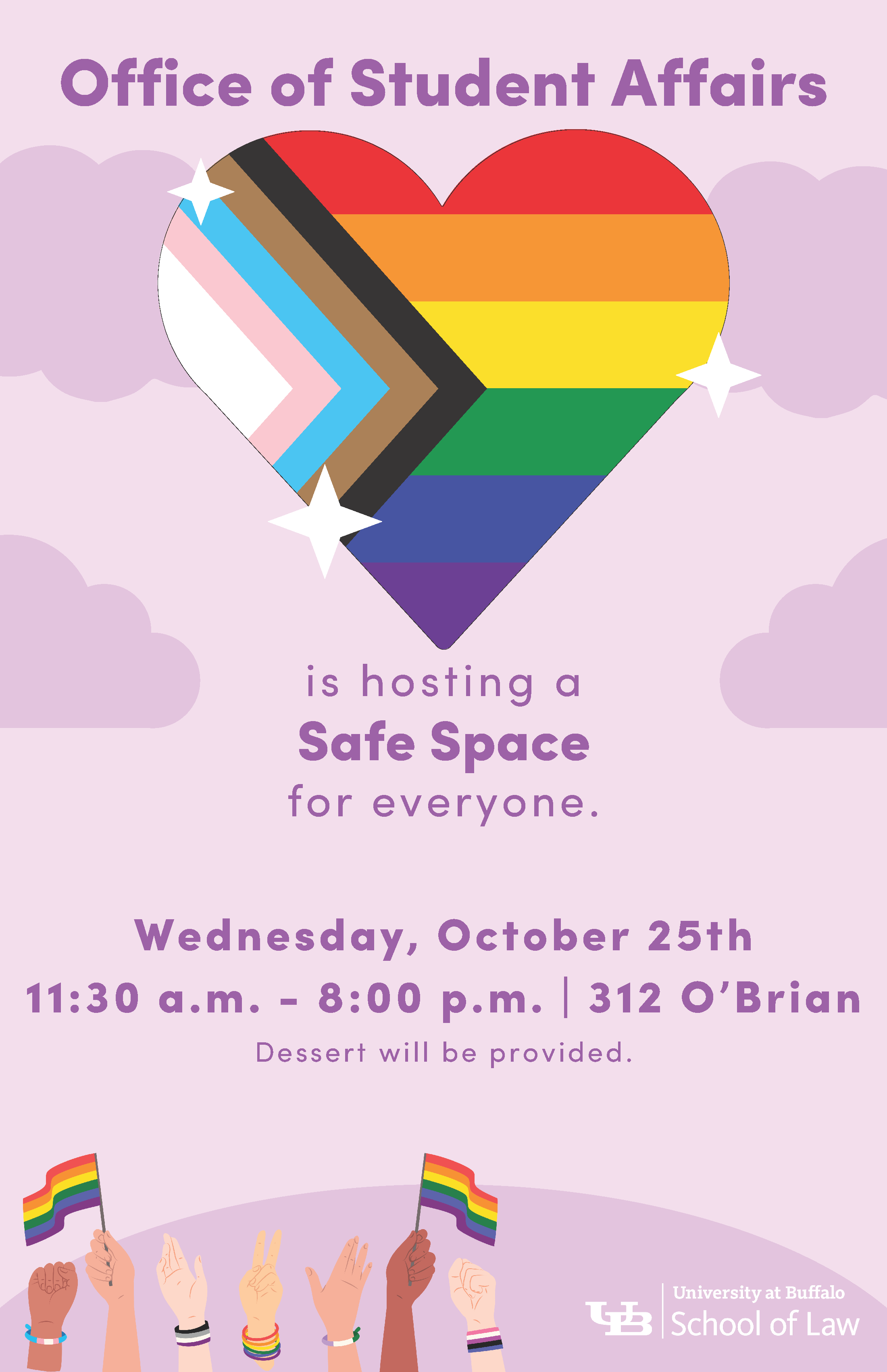 The Office of Student Affairs is hosting a safe space on 10/25 from 11:30 a.m. - 8:00 p.m. for all law school students, staff, and faculty in 312 O'Brian Hall. We are hosting this safe space as we are committed to ensuring our campus is a safe and welcoming environment for our marginalized communities. At UB, every community member should feel comfortable, safe, and know that they will find friends and allies here.