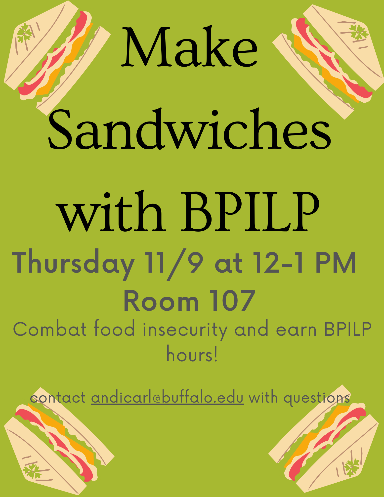 Join BPILP in making bagged lunches for people experiencing food insecurity in Buffalo. Just bring yourself (and a friend!) as all supplies will be provided. Note that the sandwiches will contain peanut butter. BPLIP hours will be awarded for attendance (which are helpful in applying for summer fellowships). Contact Lexi (andicarl@buffalo.edu) with questions or concerns. We look forward to seeing you there!