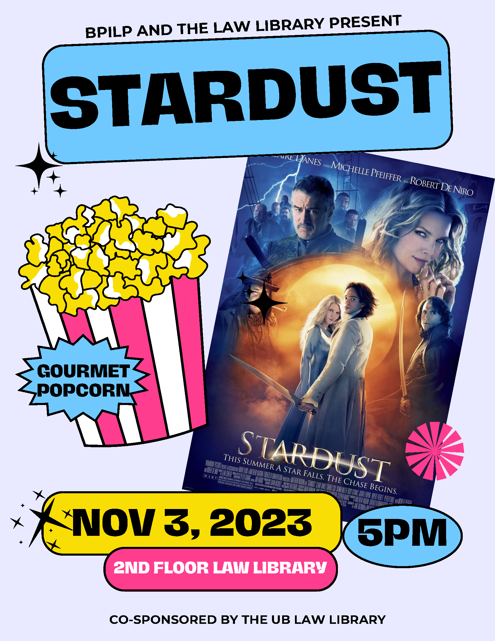 Join BPILP & Law Library at 5 p.m. on 11/3 to eat gourmet popcorn and watch Stardust in the Law Library! RSVP by emailing law-bpilp@buffalo.edu.