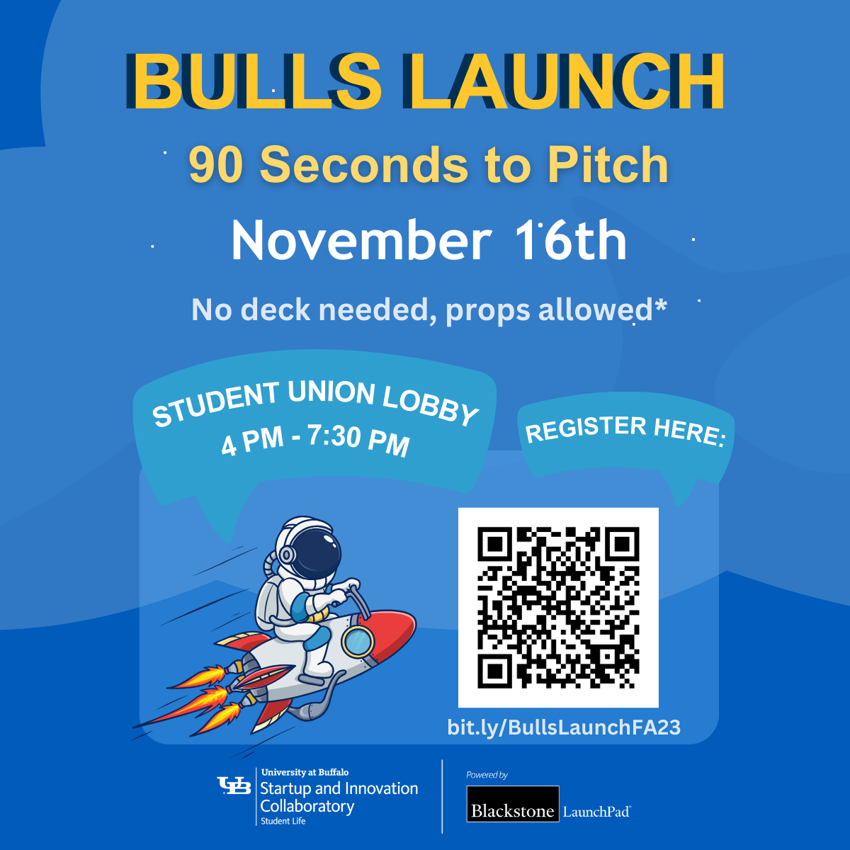 The CoLab is hosting UB’s annual Bulls Launch Competition, where you have an opportunity to present your idea in 90-seconds to a live audience and a panel of judges and we’ll hand out $3,800 in prize money! Open to all majors. An experience for both undergraduate and graduate students, business background not required.