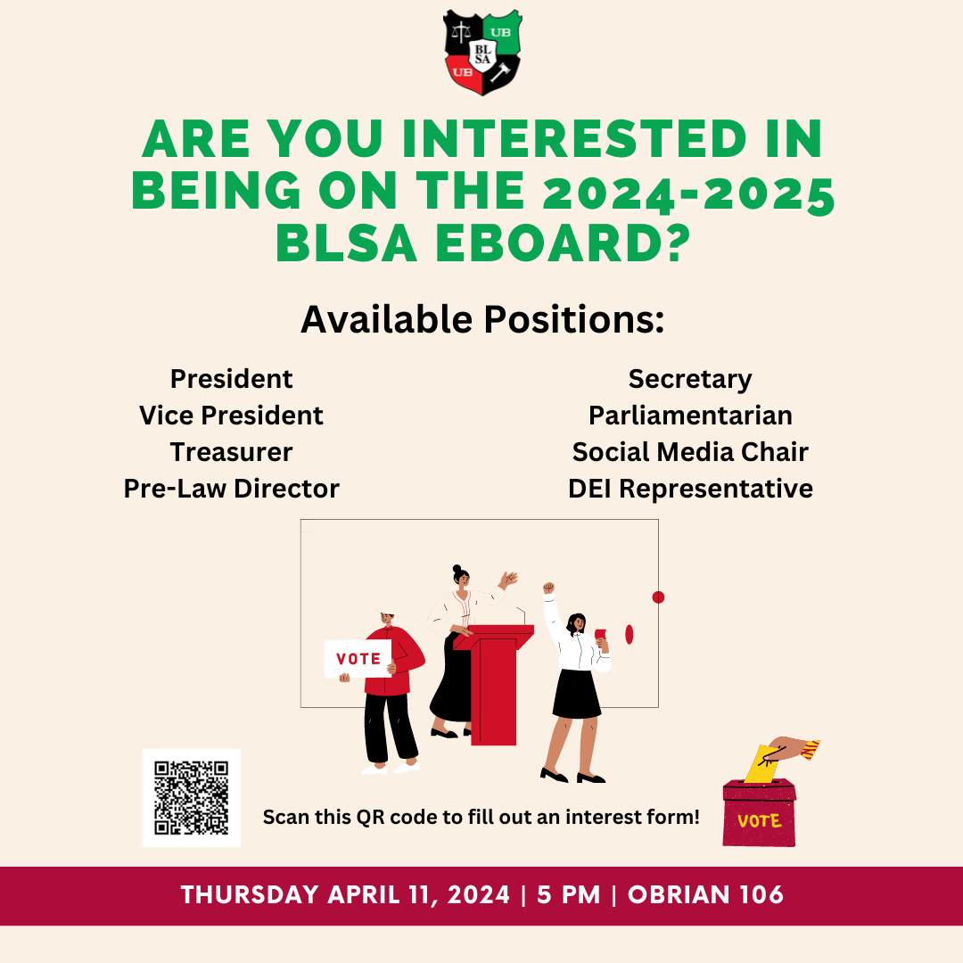 Are you interested in being on the E Board for BLSA? Scan the QR code on the flyer attached to fill out an interest form. Elections will take place on Thursday, April 11 in O'Brian 106 at 5 pm.