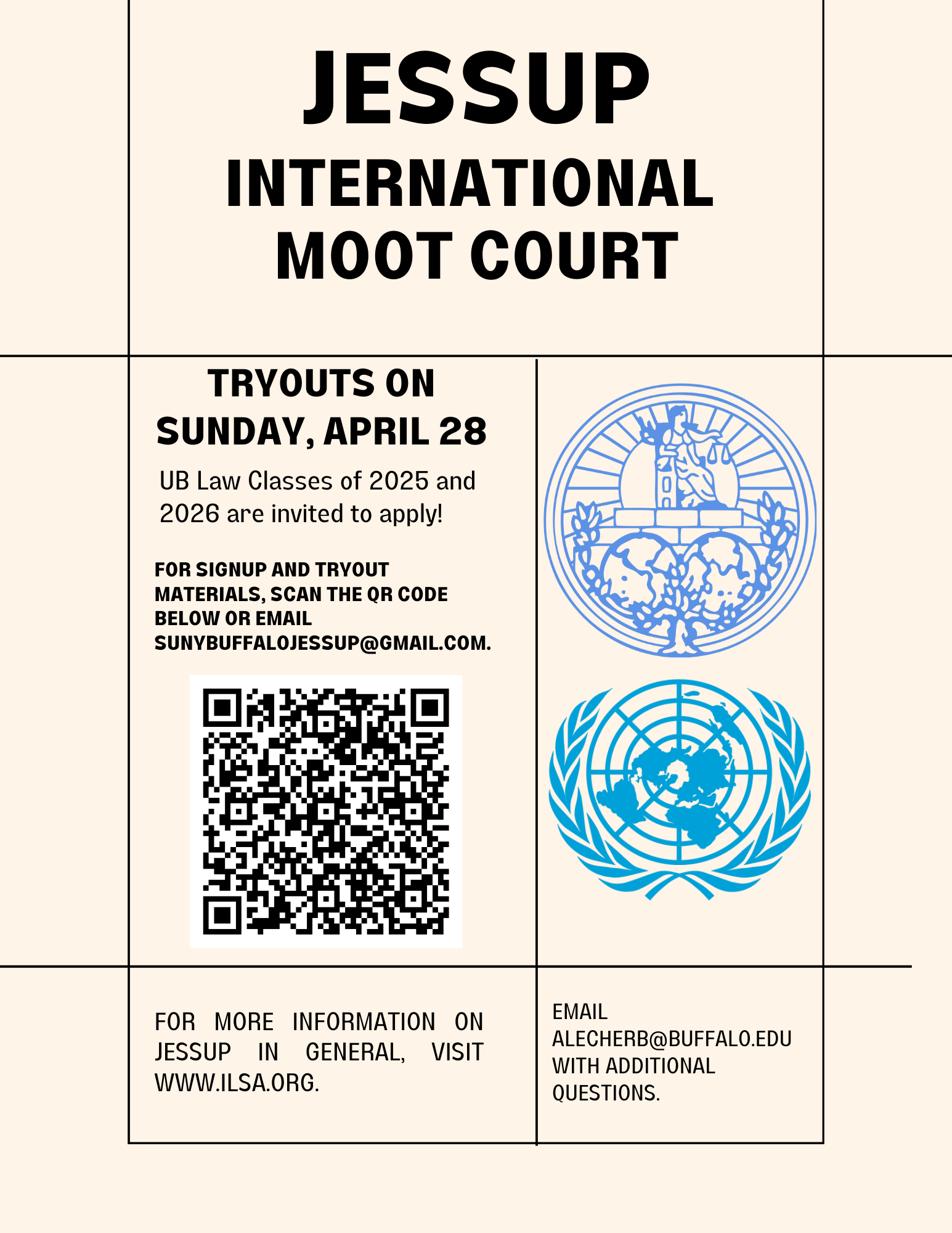 Tryouts for the Jessup International Moot Court Board will be on Sunday, April 28th from 9 am to 5 pm on campus. UB Law Classes of 2025 and 2026 are invited to apply! Students will be provided a tryout packet in advance. If you have any questions, please email the Jessup Internation Moot Court Board.